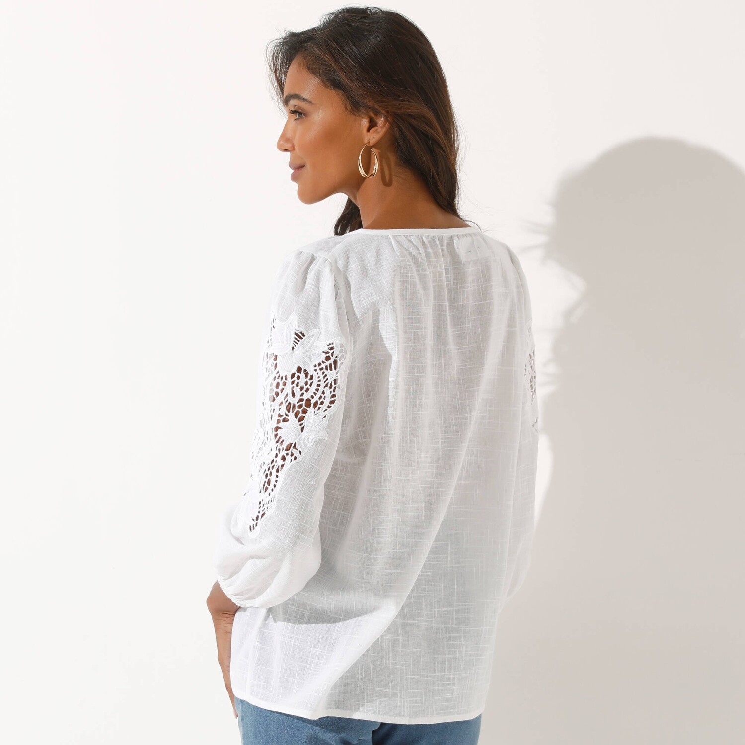 Bluzka w jednolitym kolorze z makramą i ażurowym haftem
