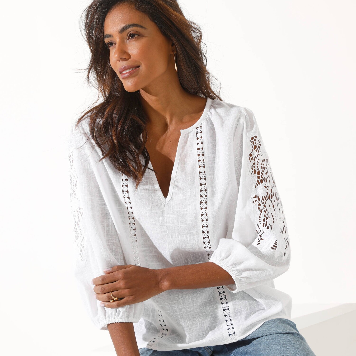 Bawełniana bluzka oczaruje Cię swoim ponadczasowym, romantycznym stylem. Okrągły dekolt z wycięciem. Ażurowy pas makramowy z przodu. Marszczenie z tyłu dekoltu. Rękawy o szerokości 3/4 z ażurowym haftem. Elastyczne zakończenia rękawów. Prosty dół. Można prać w pralce.