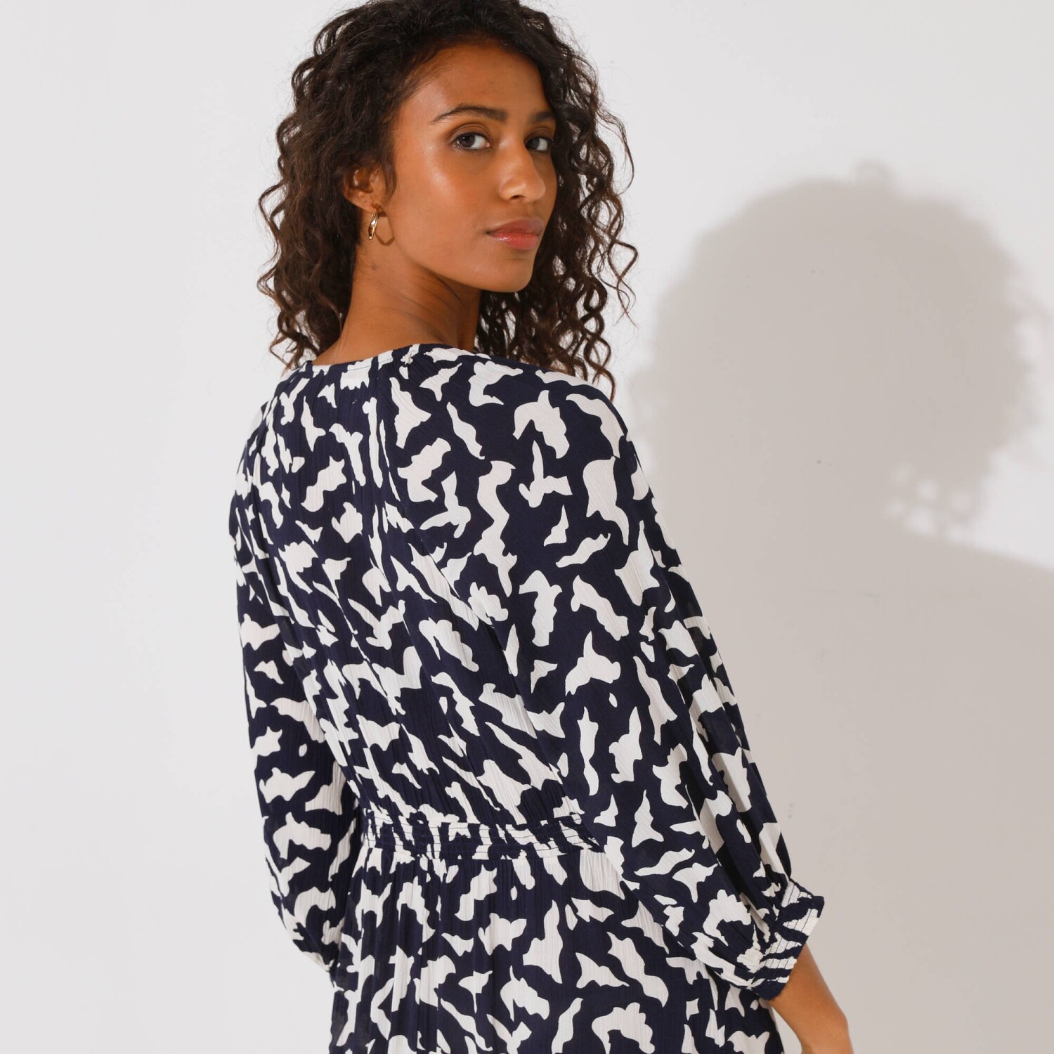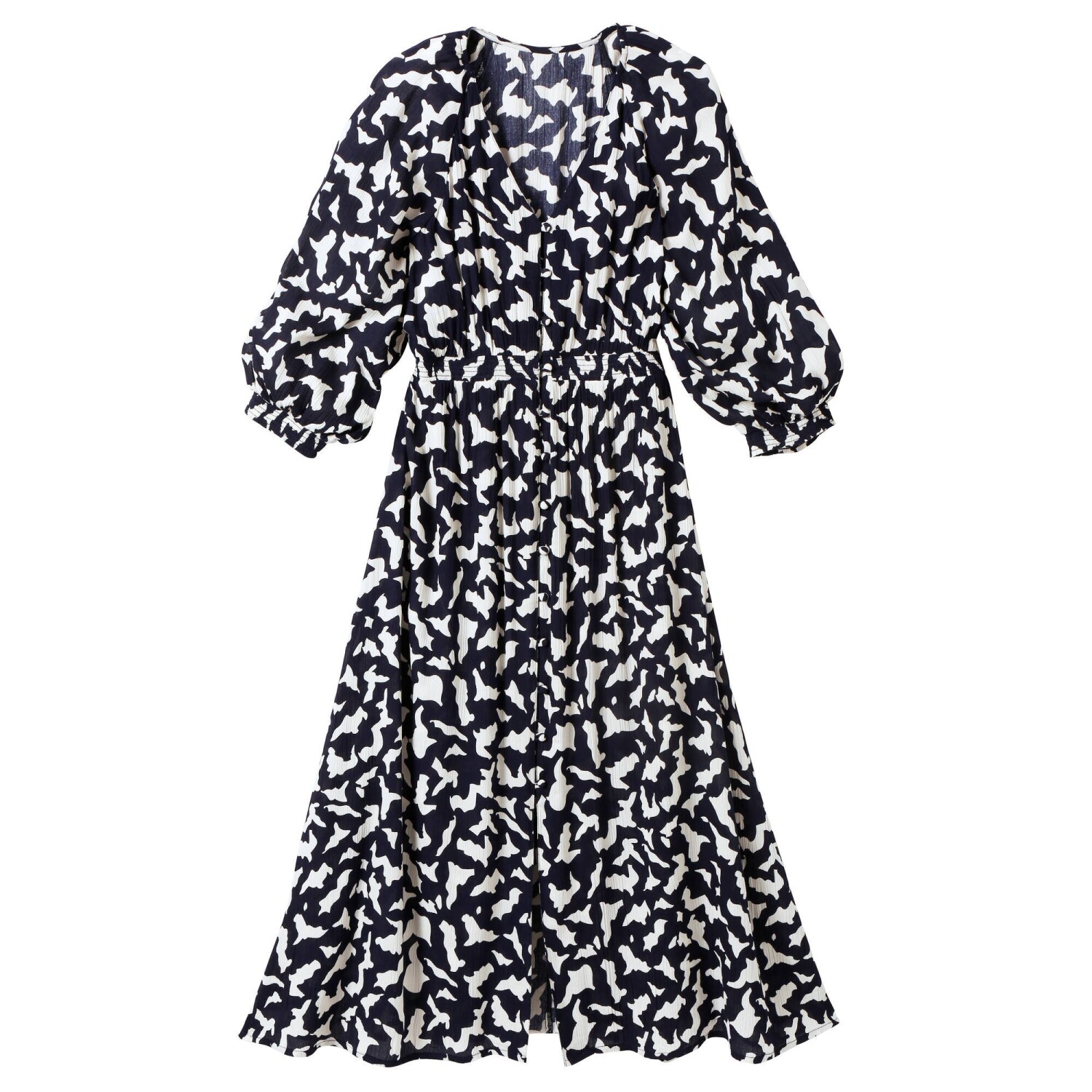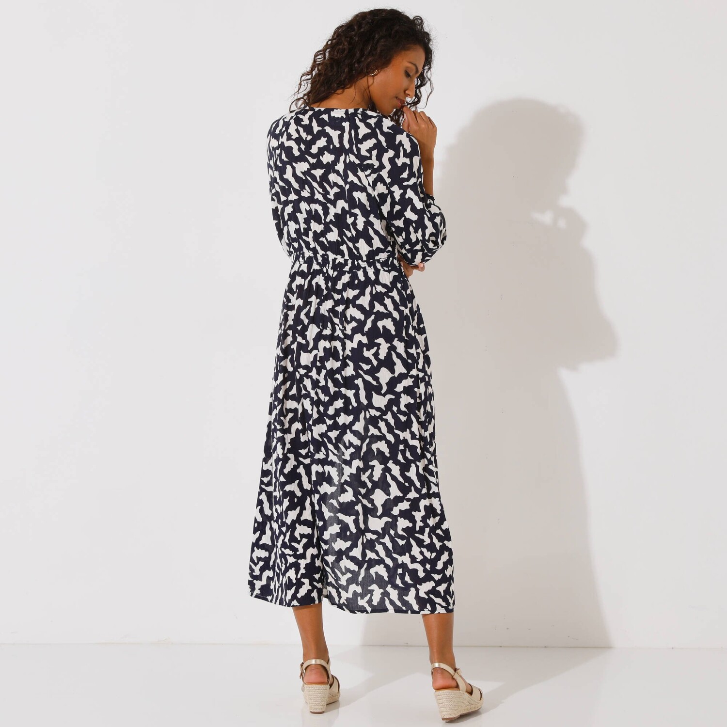 Okrągły dekolt z oryginalnym dołem. Elastyczne wycięcie pod biustem. Długie, elastyczne rękawy z falbanką. Szeroka falbana u dołu. Ozdobny dół. Można prać w pralce.