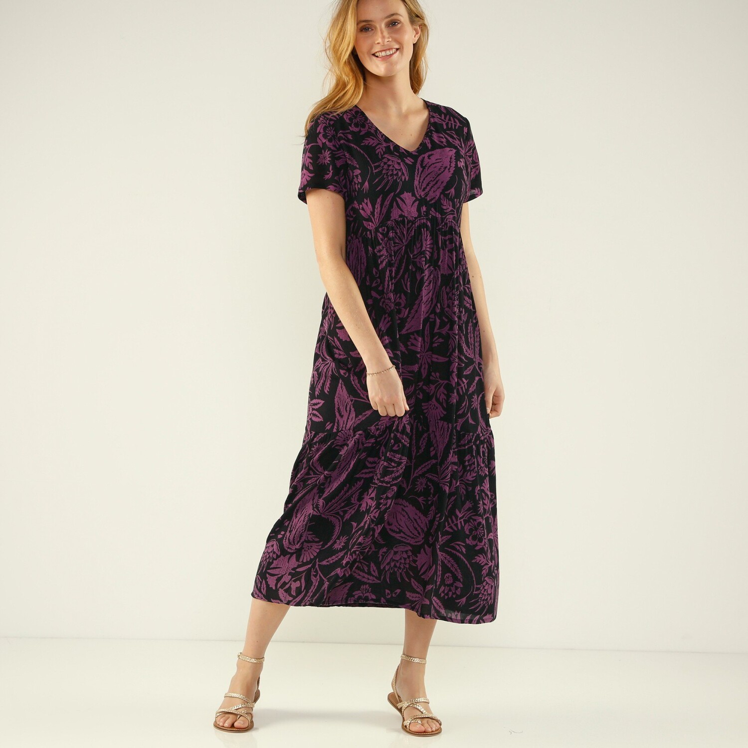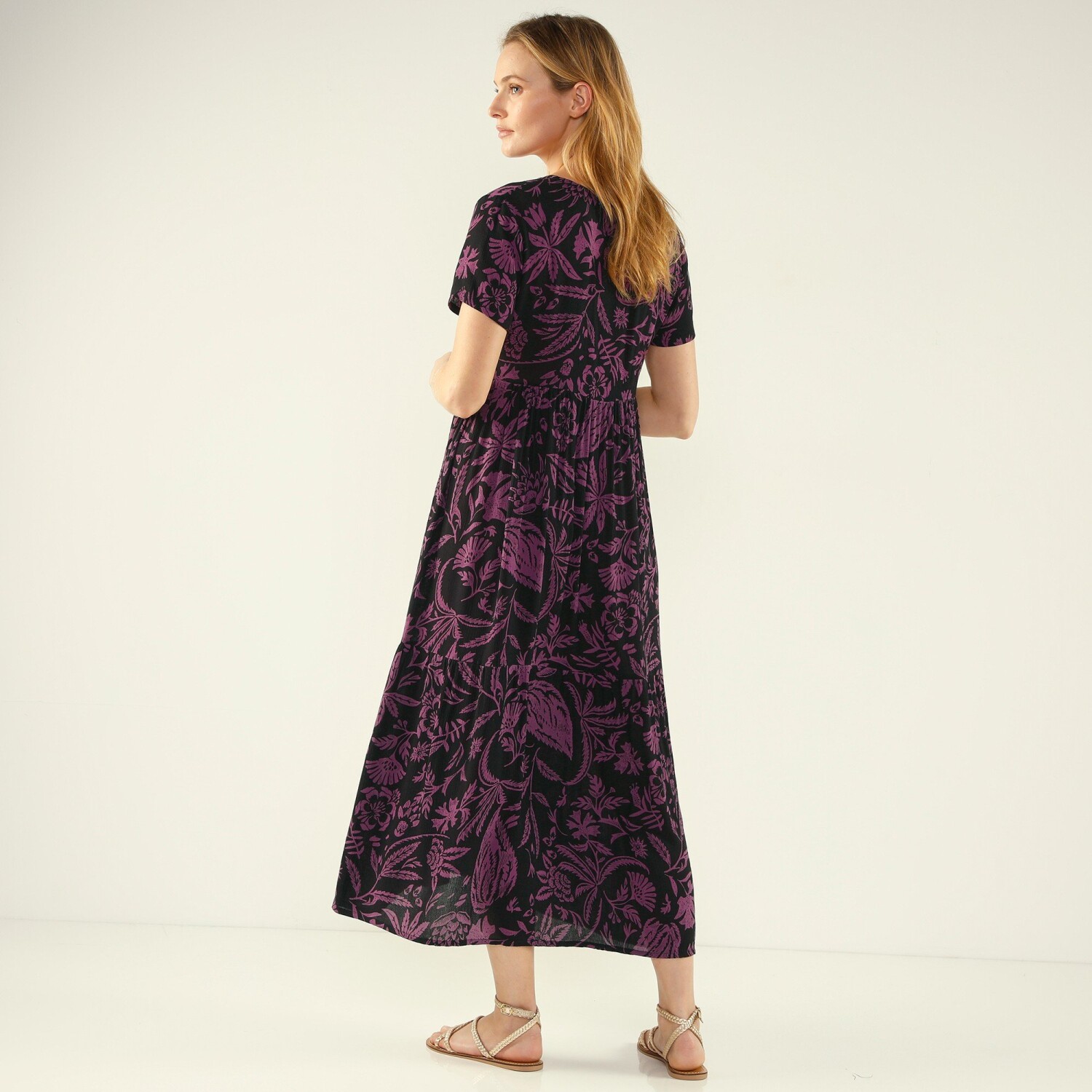 Długa sukienka z zapinanym dekoltem i krótkimi rękawami, wykonana z kreponu z nadrukiem