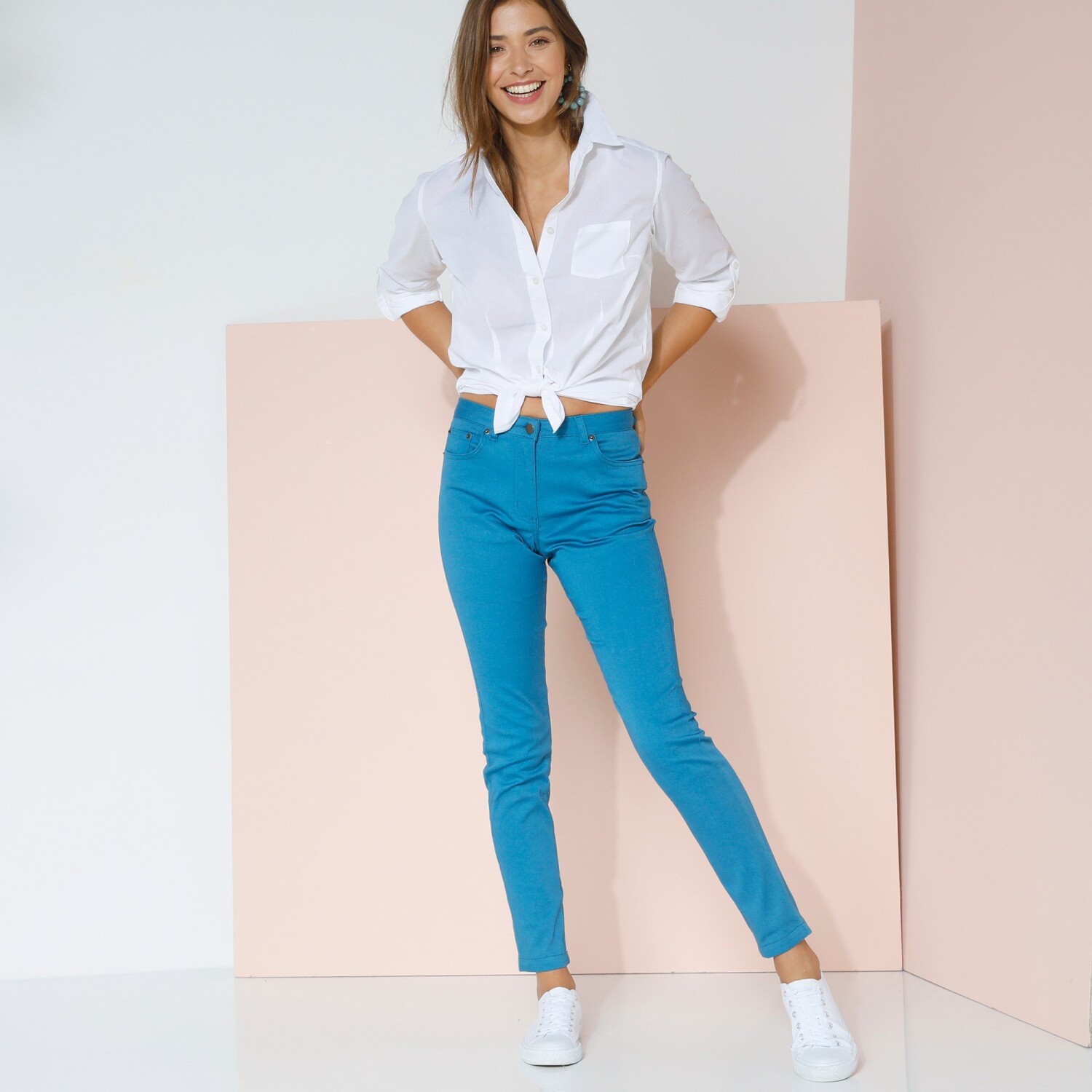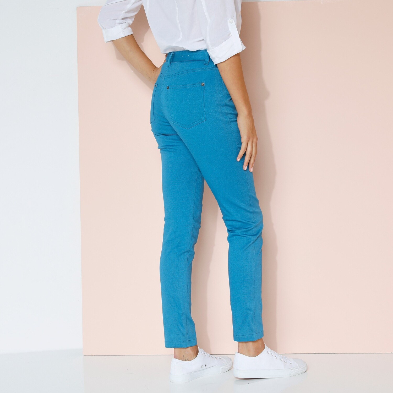 Odśwież swoją garderobę wąskimi kolorowymi spodniami z wygodnego denimu. Regularna wysokość talii. 5 kieszeni. Wąski krój. Zapięcie na suwak i guzik. Kształtowany pas jest elastyczny z tyłu po bokach od rozmiaru 44. Można prać w pralce.
