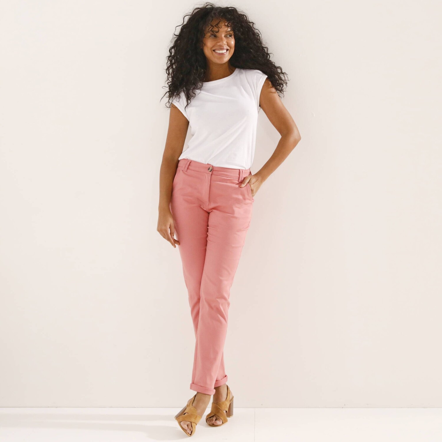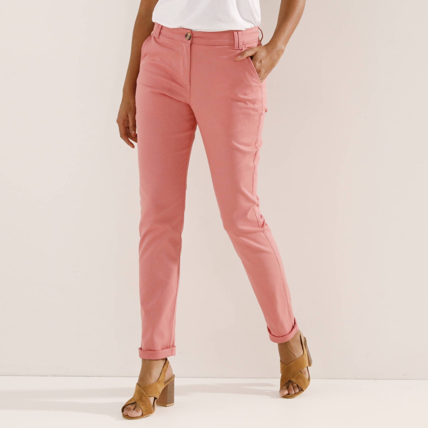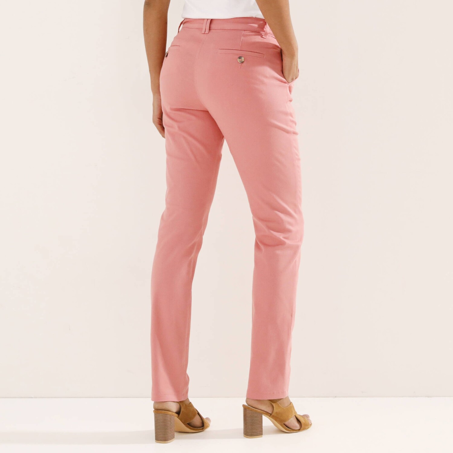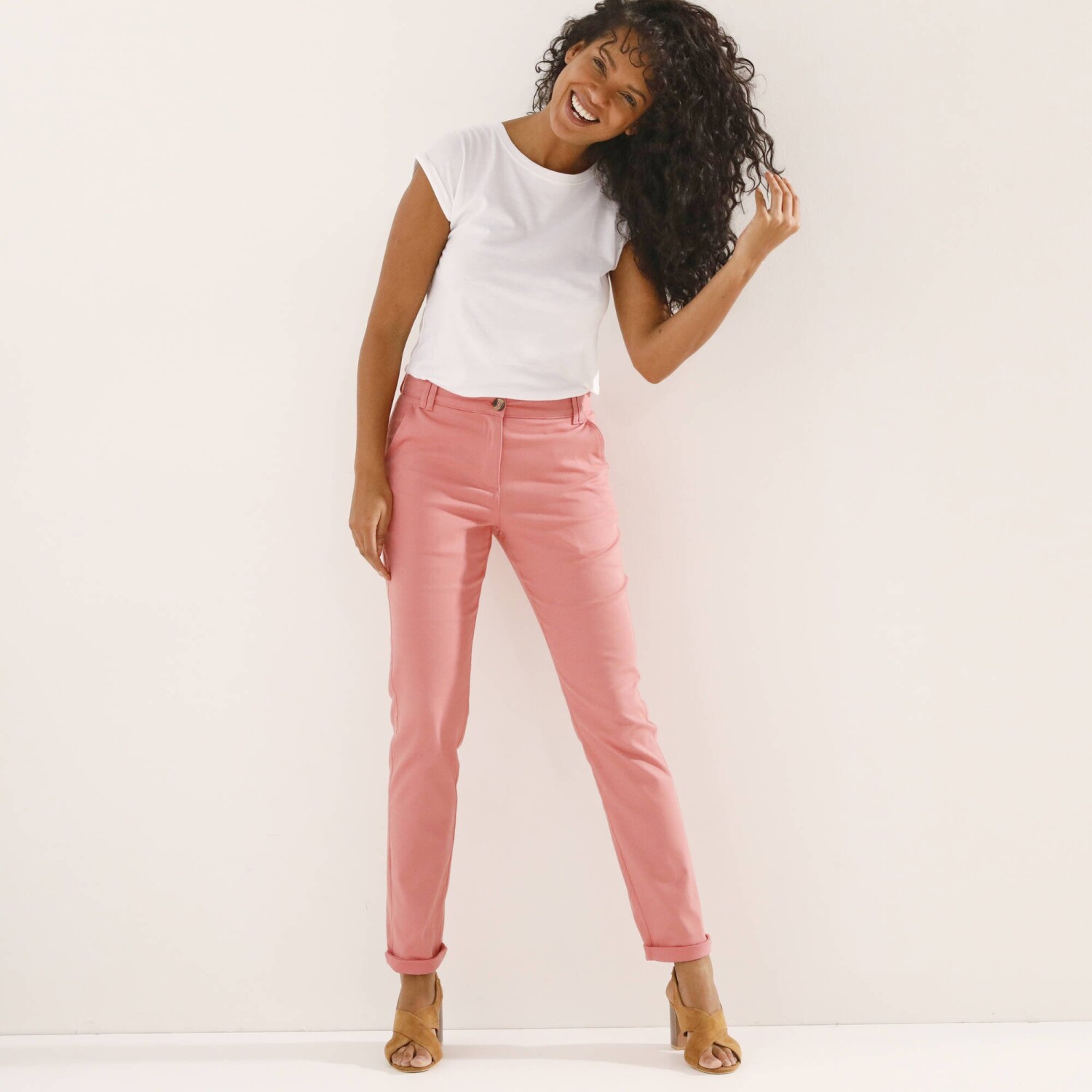 Bardzo modne spodnie o kroju elastycznego chino, które można dowolnie podwijać. Spodnie mają regularną wysokość talii. W pasie szlufki, gumka po bokach od rozmiaru 44. Zapięcie na zamek błyskawiczny i guzik. 2 wpuszczane kieszenie z przodu. Z tyłu 2 naszywane kieszenie i 2 kieszenie zapinane na guziki. Standard 100 według Oeko-Tex (CQ 1216/3 IFTH). Znak ten identyfikuje produkty tekstylne, które zostały poddane testom laboratoryjnym pod kątem szerokiej gamy szkodliwych substancji, a produkt jest bezpieczny ponad obowiązujące normy. Można prać w pralce.