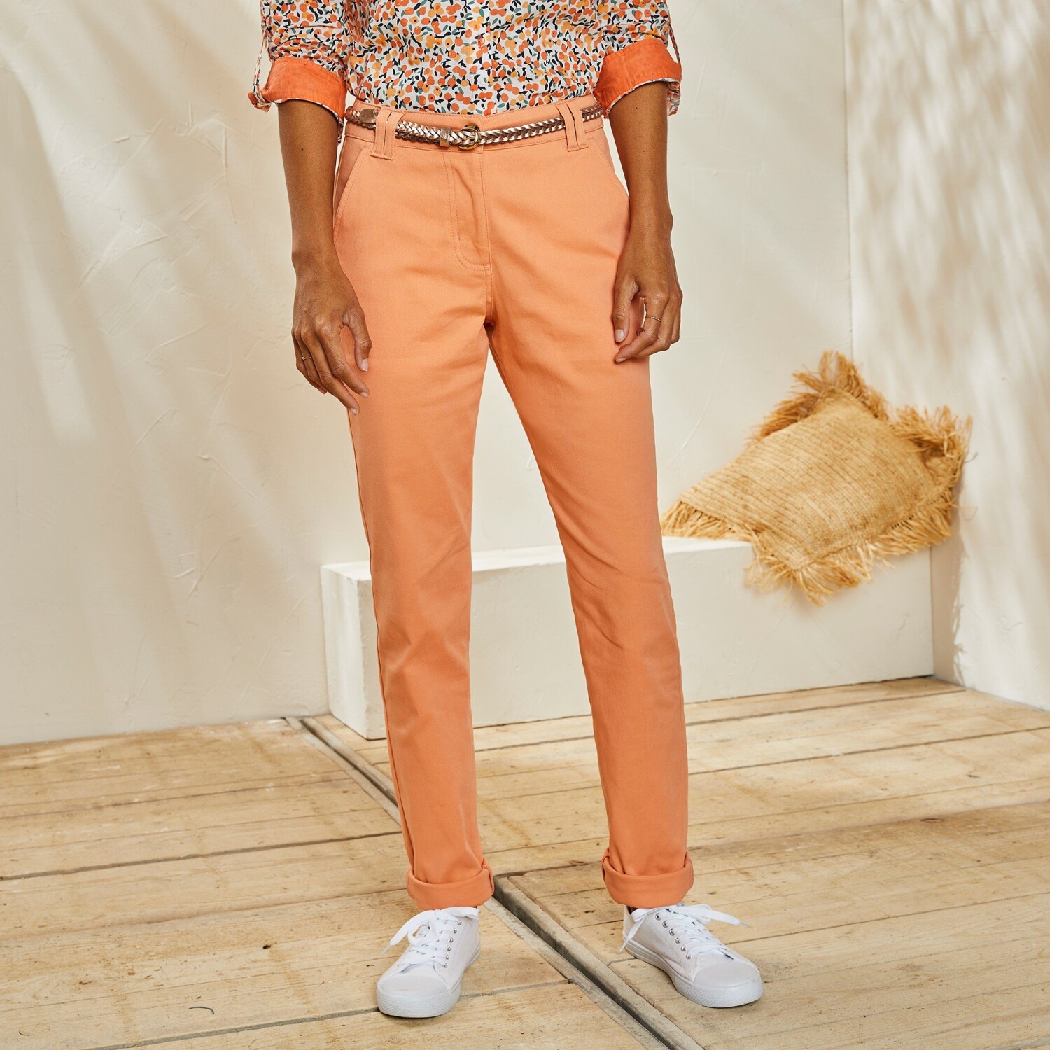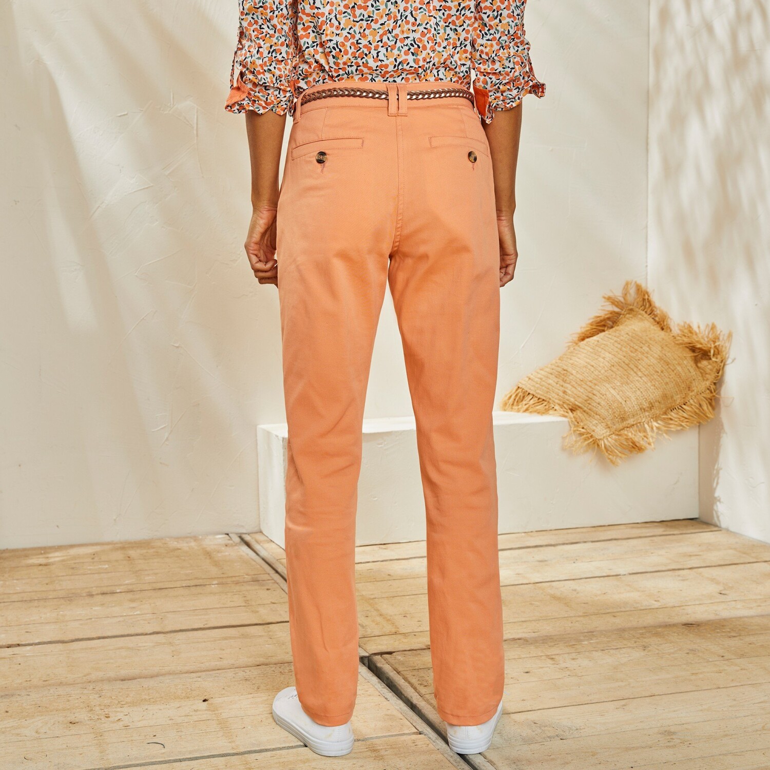 Bardzo modne spodnie o kroju elastycznego chino, które można dowolnie podwijać. Spodnie mają regularną wysokość talii. W talii szlufki, po bokach gumki od rozmiaru 44. Zapięcie na zamek błyskawiczny i guzik. 2 wpuszczane kieszenie z przodu. Z tyłu 2 naszywane kieszenie i 2 kieszenie zapinane na guziki. Można prać w pralce.