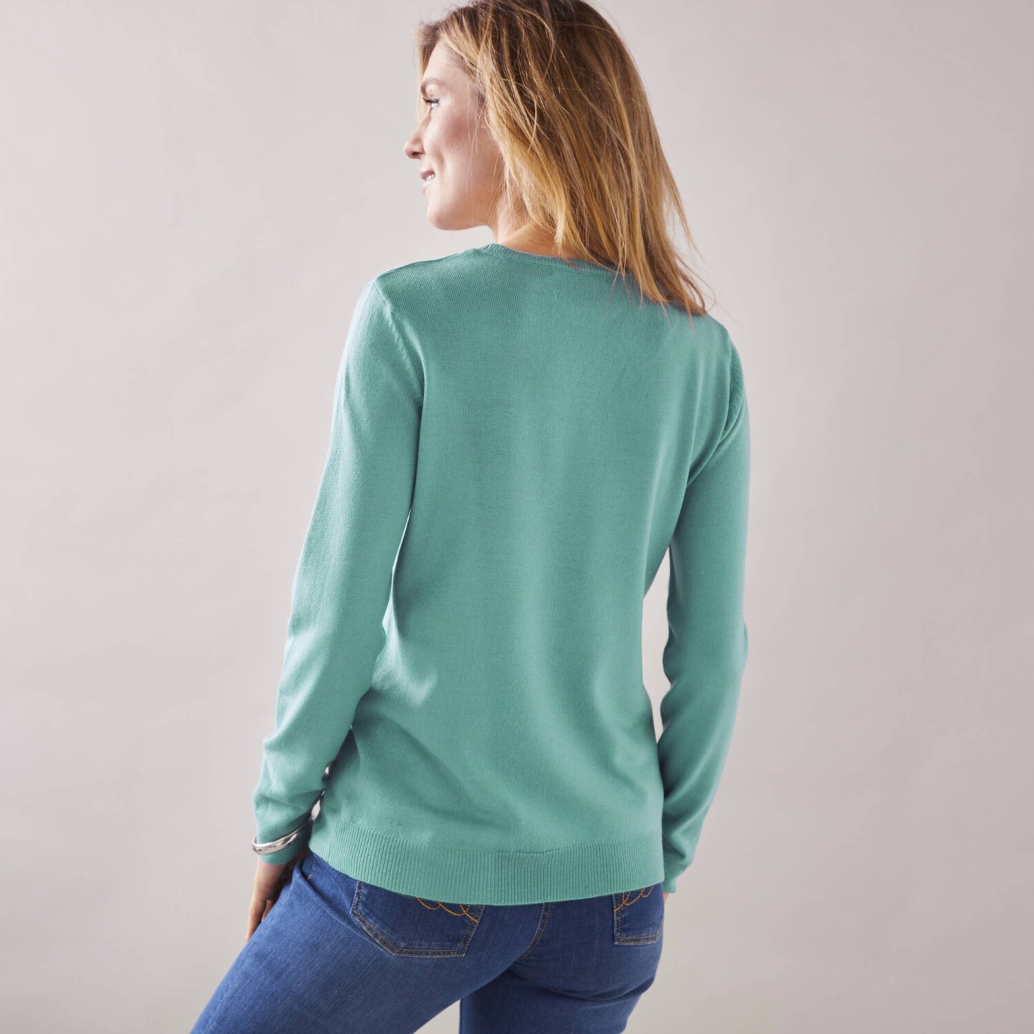 Okrągły sweter z miękkiej w dotyku dzianiny przekonał nas do siebie. Prosty krój ułatwiający utrzymanie. Okrągły dekolt. Długie rękawy. Prosty dół. Można prać w pralce.