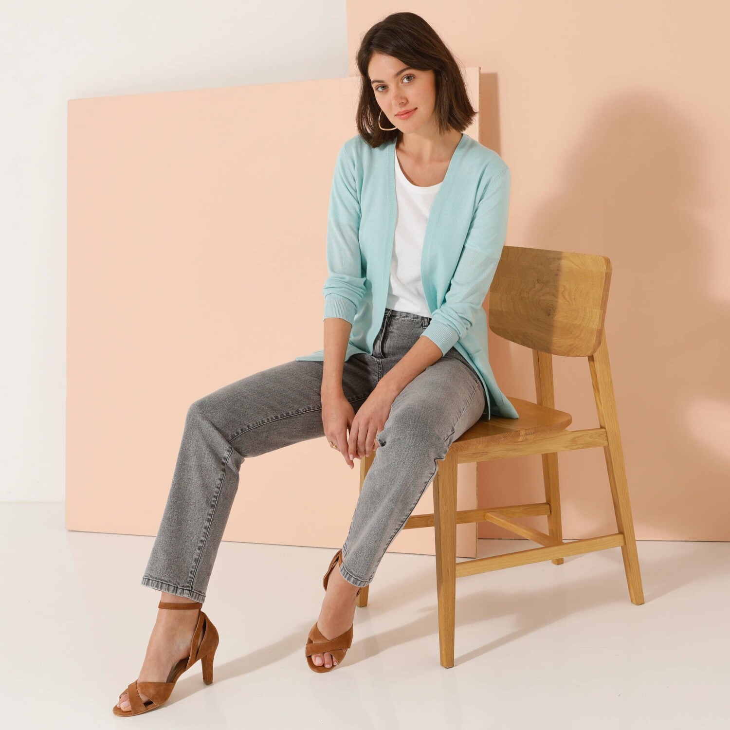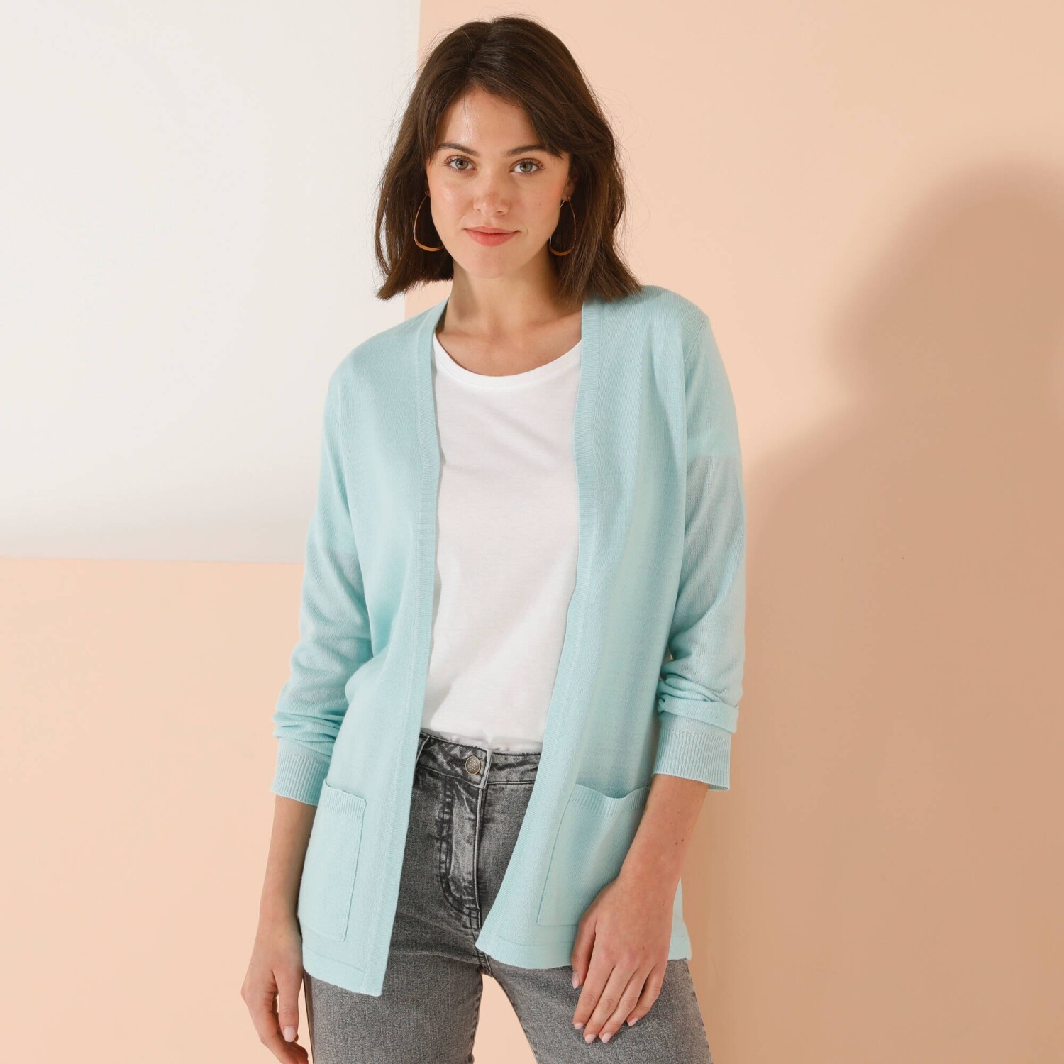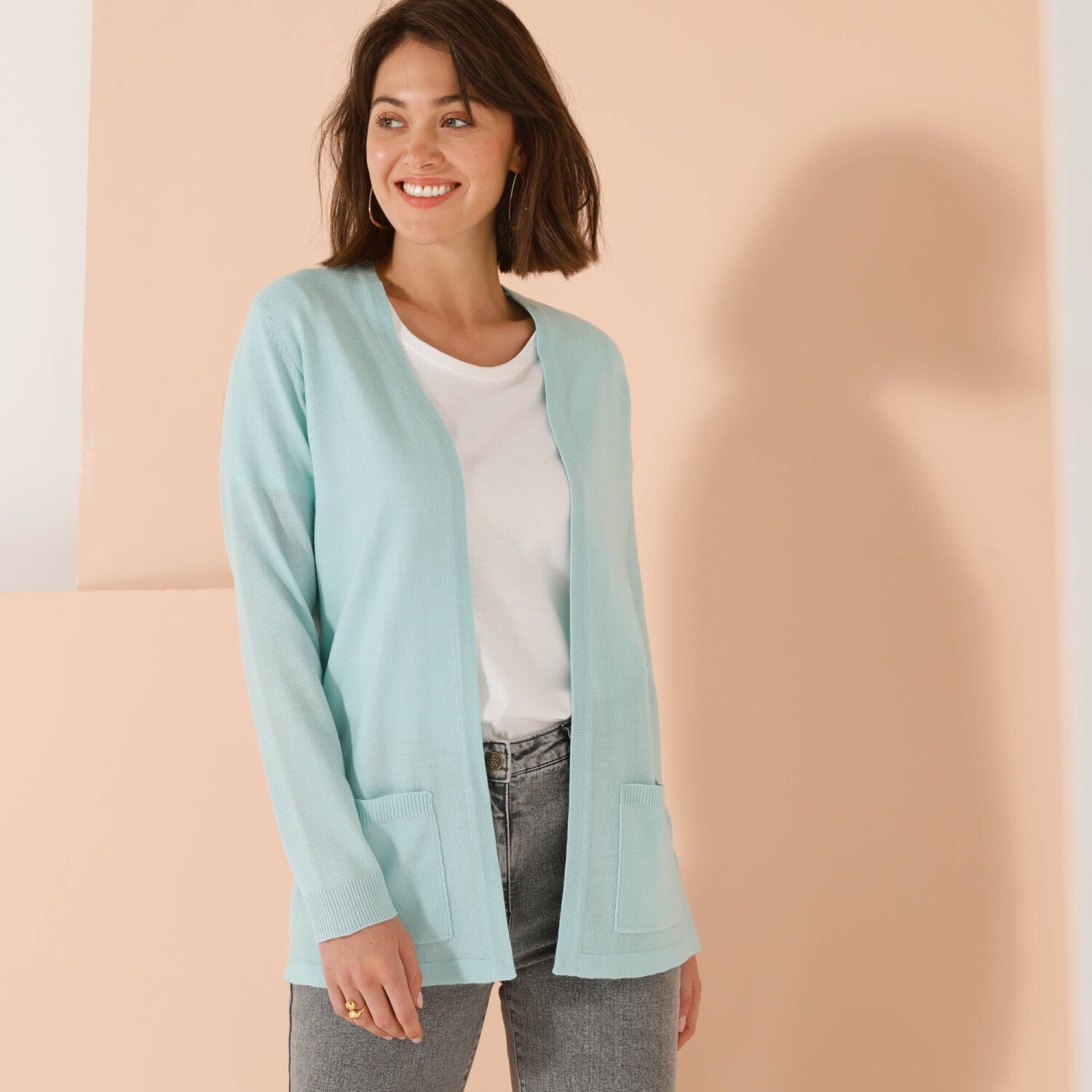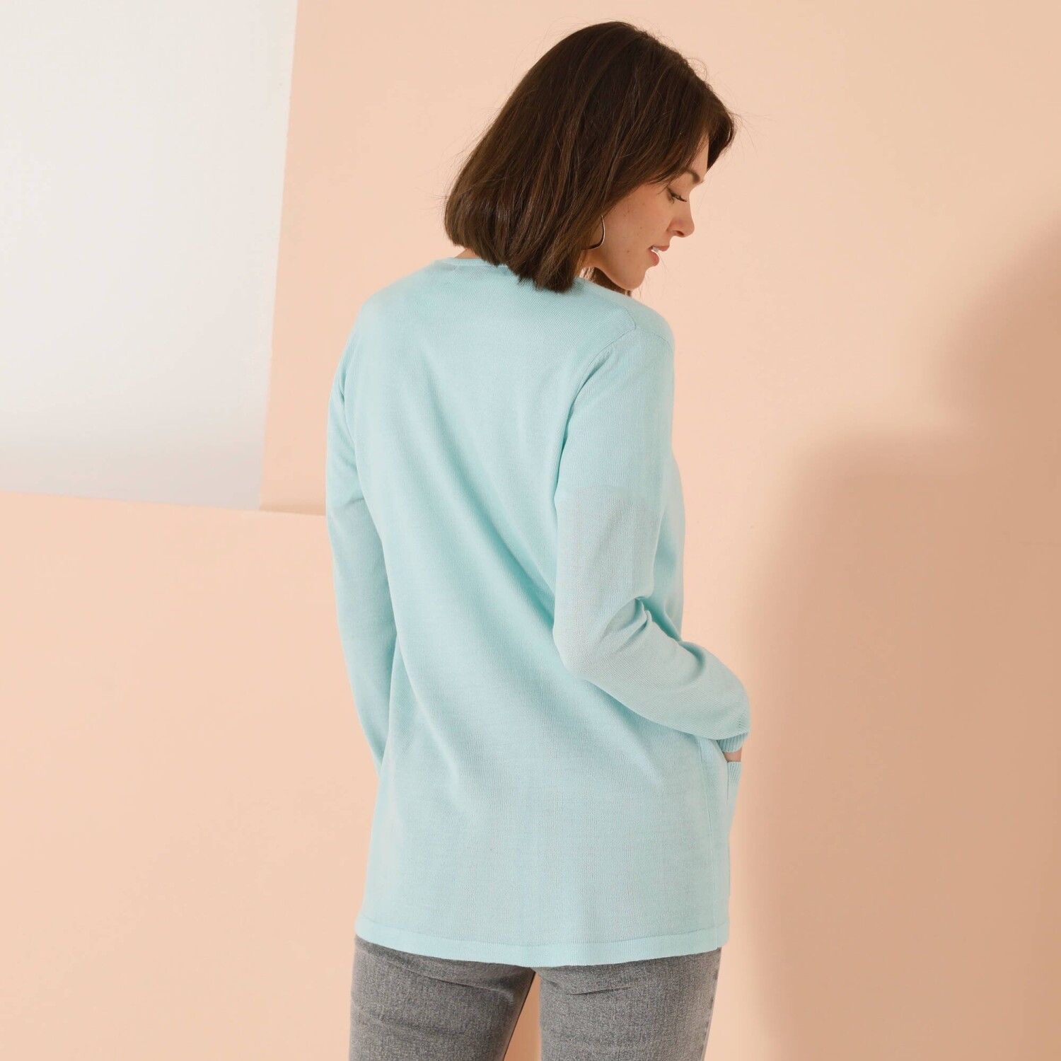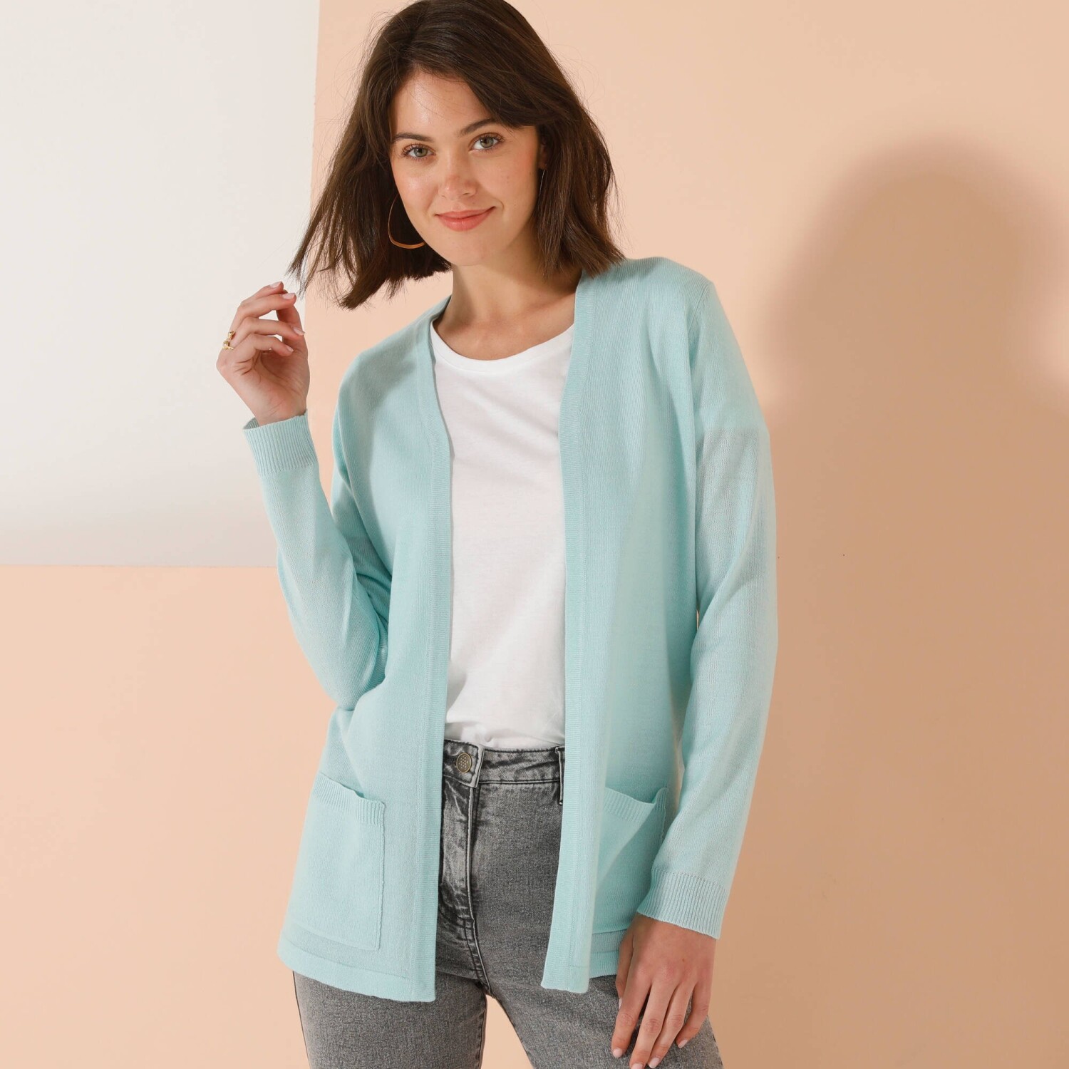 Odkryj dużą dawkę miękkości w postaci kaszmirowego w dotyku kardiganu. Długość poniżej pośladków. 2 kieszenie z przodu. Długie rękawy. Prosty dół.