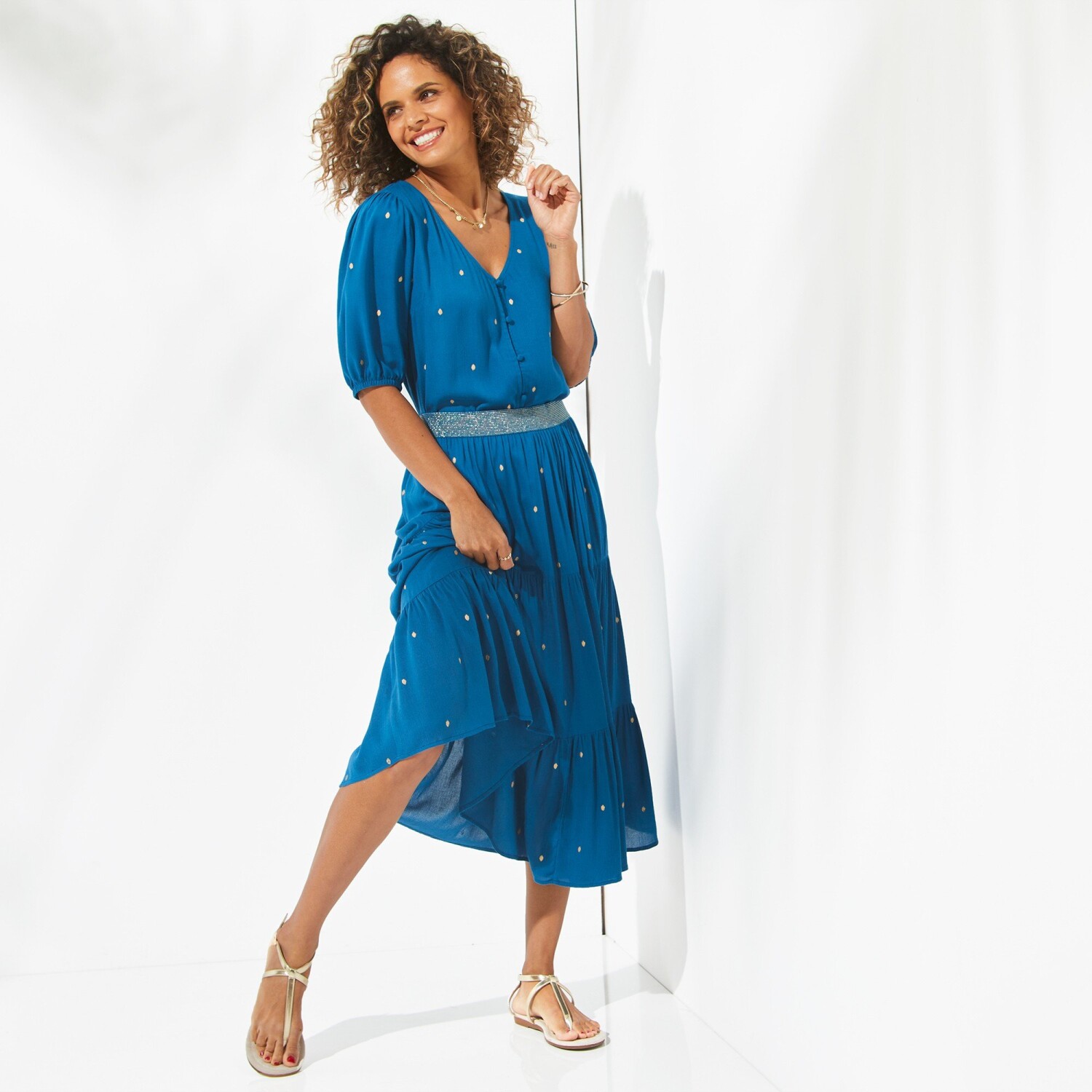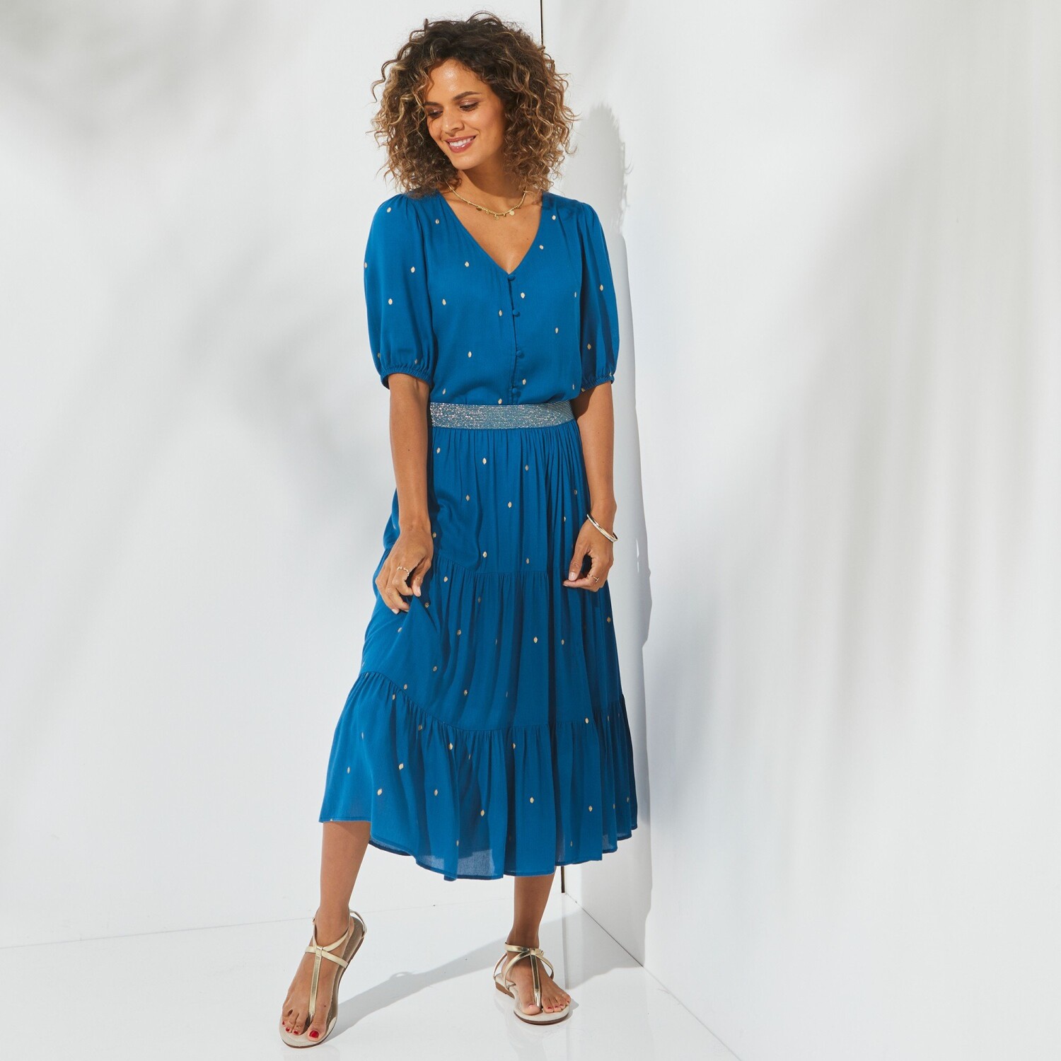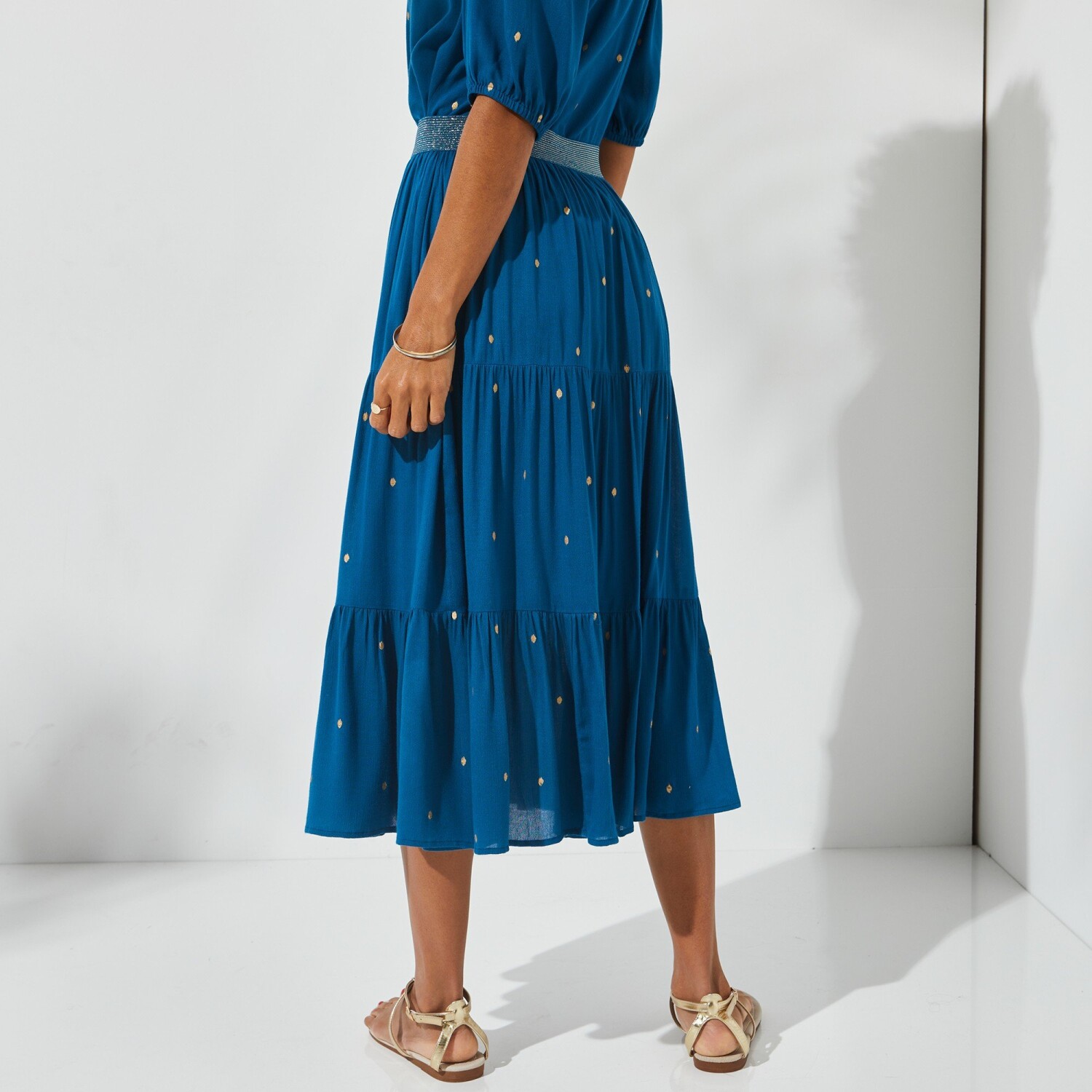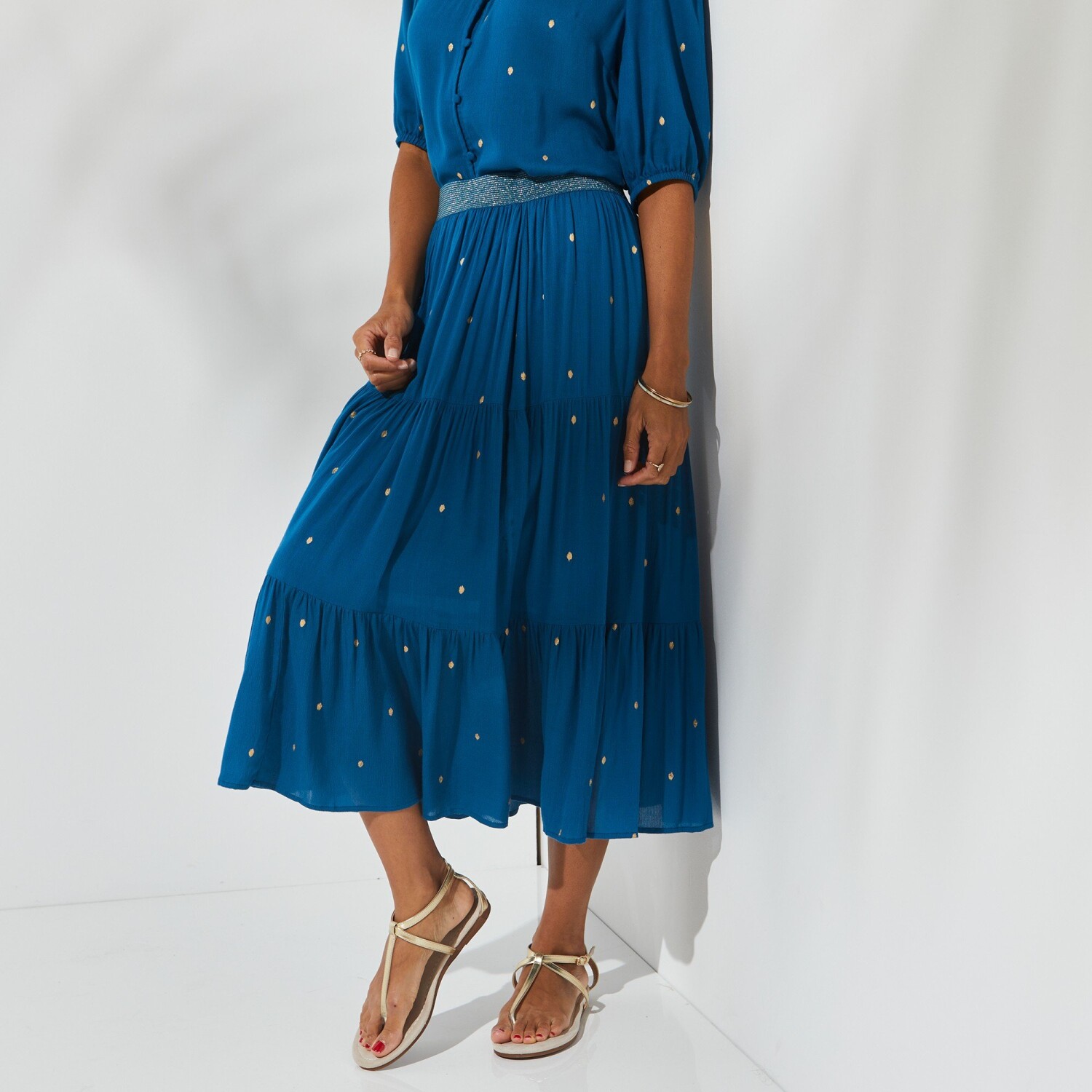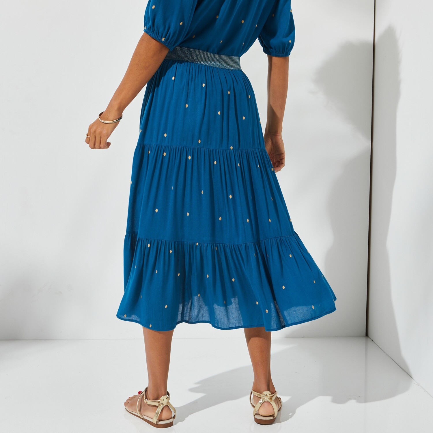 Falbaniasta spódnica midi ze złotym nadrukiem