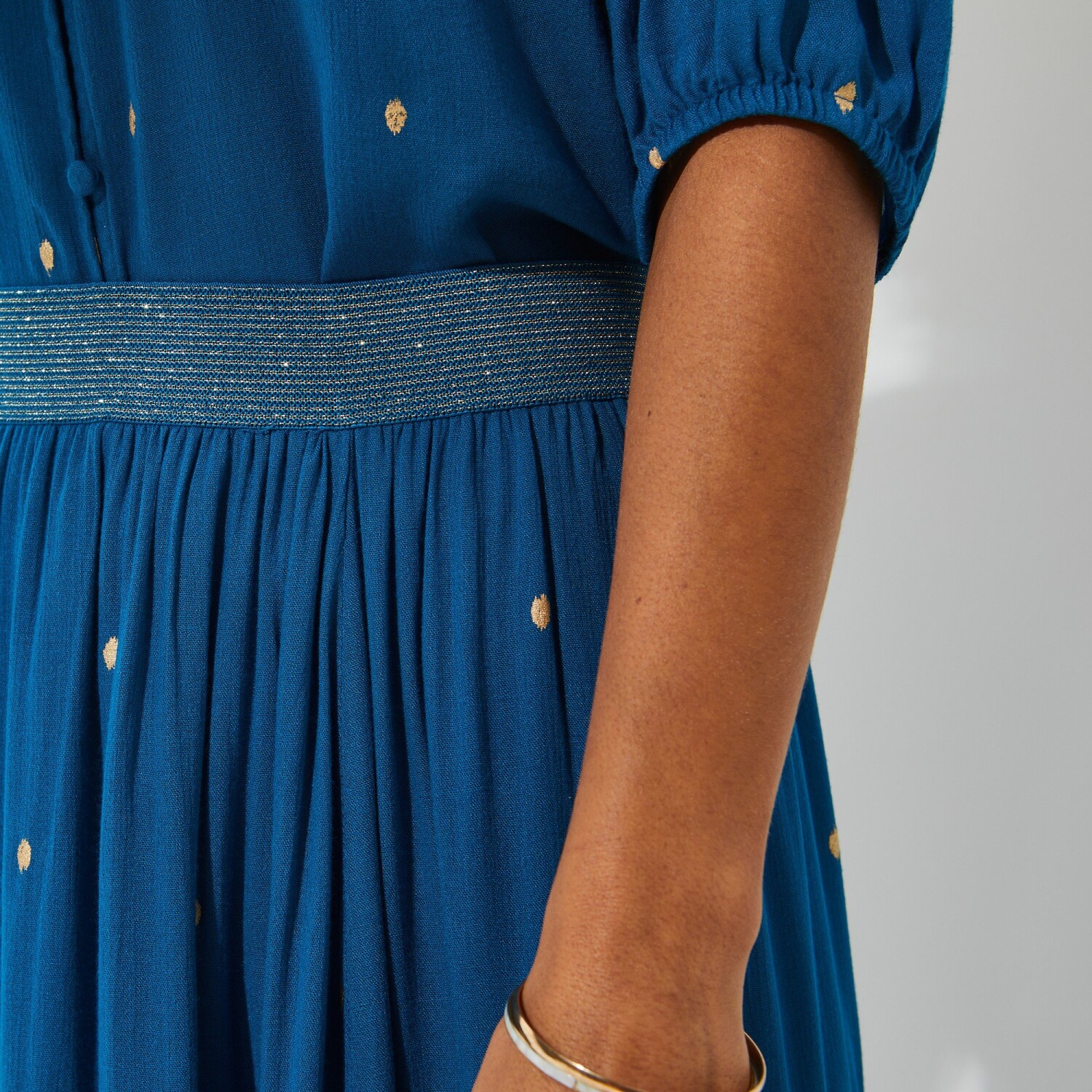 Krótka spódnica z kreponu ze złotym nadrukiem jest oszałamiająca. Długość przed kolano. Nadruk. Elastyczny złoty pas. Długość przed kolano. 3 lekko marszczone falbany dla pożądanej objętości. Podszewka. Można prać w pralce.