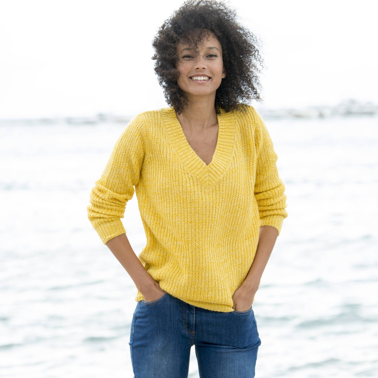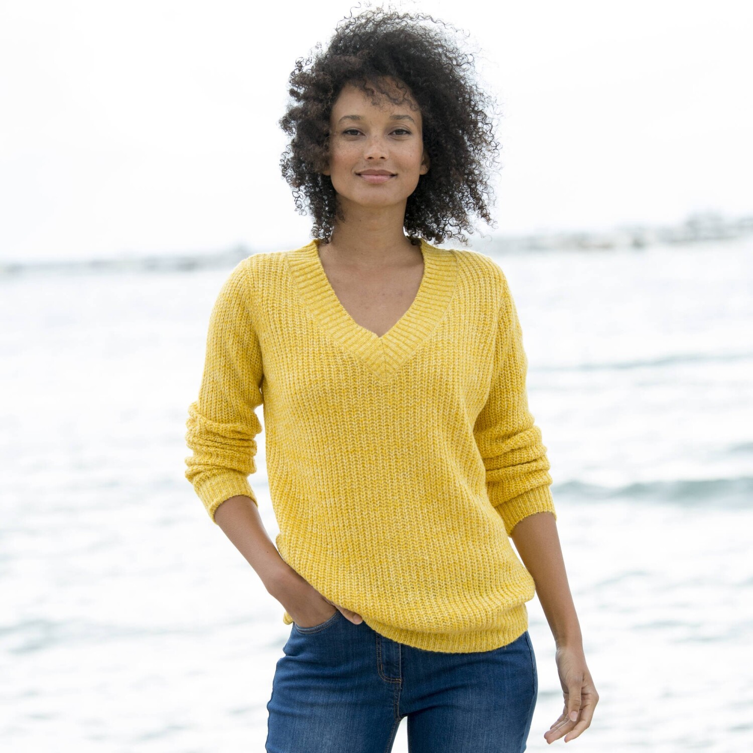 Luźny sweter z dekoltem w szpic sprawdzi się na różne okazje. Delikatna, miękka dzianina. Dekolt w szpic z szerokim elastycznym dołem. Długie rękawy. Prosty dół. Można prać w pralce.