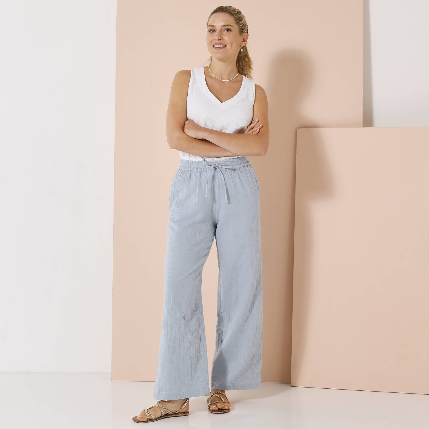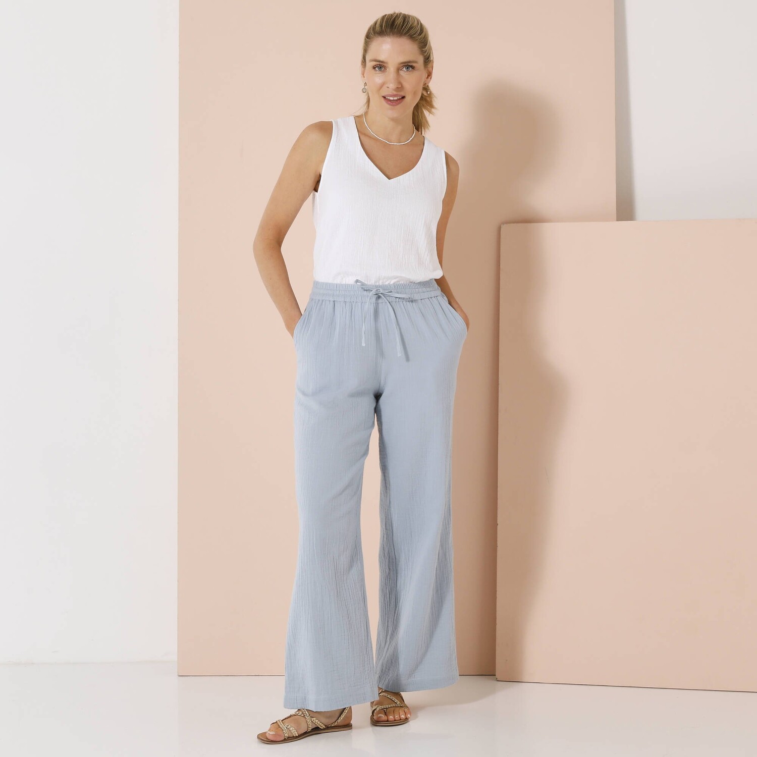Nowoczesny krój, lekki, łatwy w pielęgnacji materiał i szeroka gama kolorów - oto spodnie 7/8 z elastyczną talią. Krój 7/8. Elastyczny, wygodny pas. 2 naszyte kieszenie z przodu z guzikiem i oczkami. 2 naszywane kieszenie z tyłu. Można prać w pralce.
