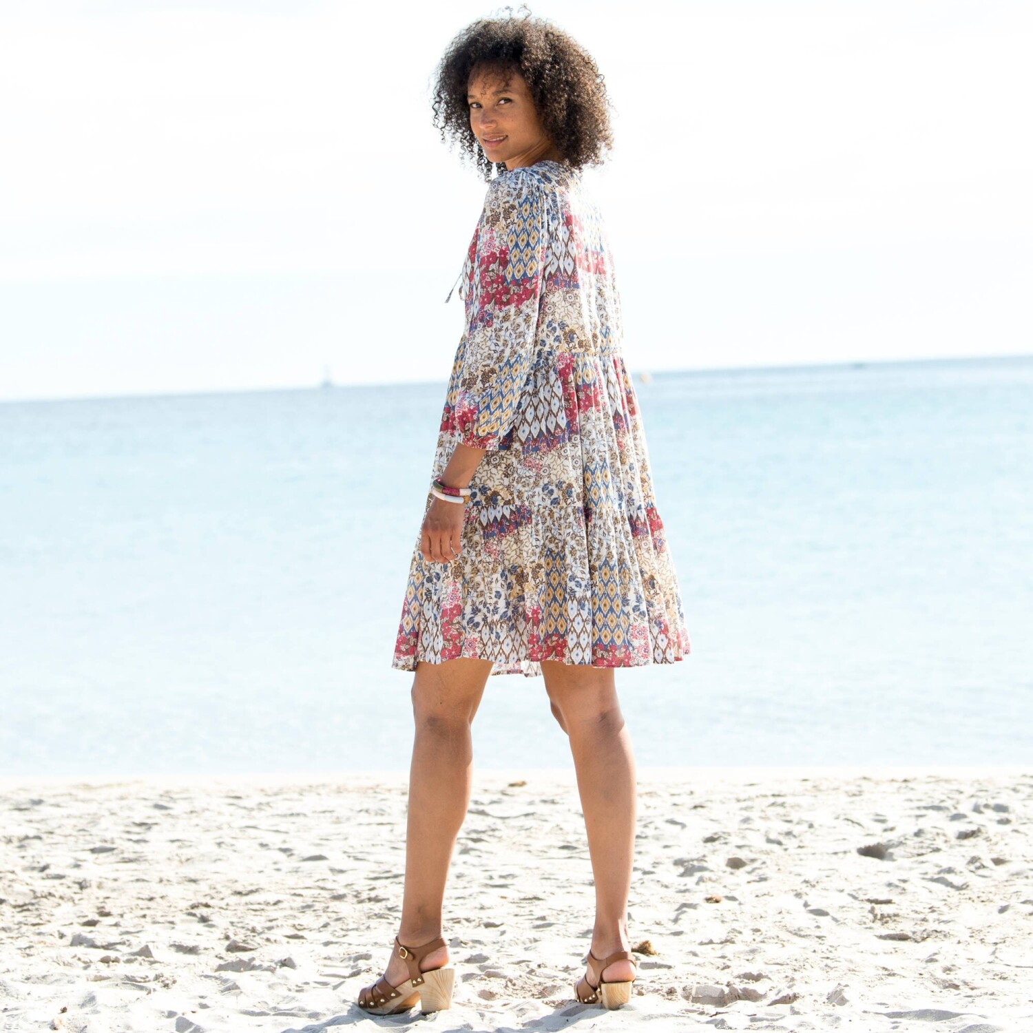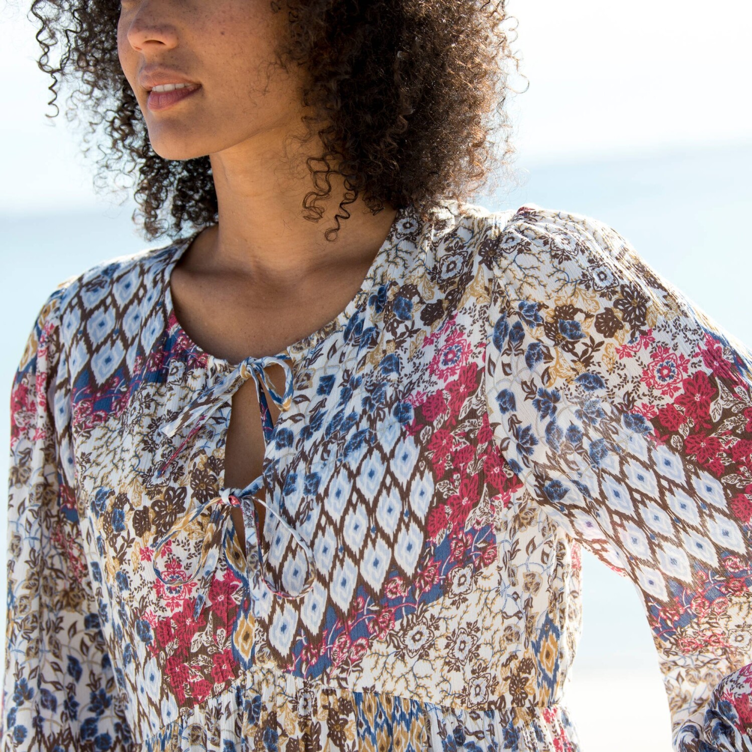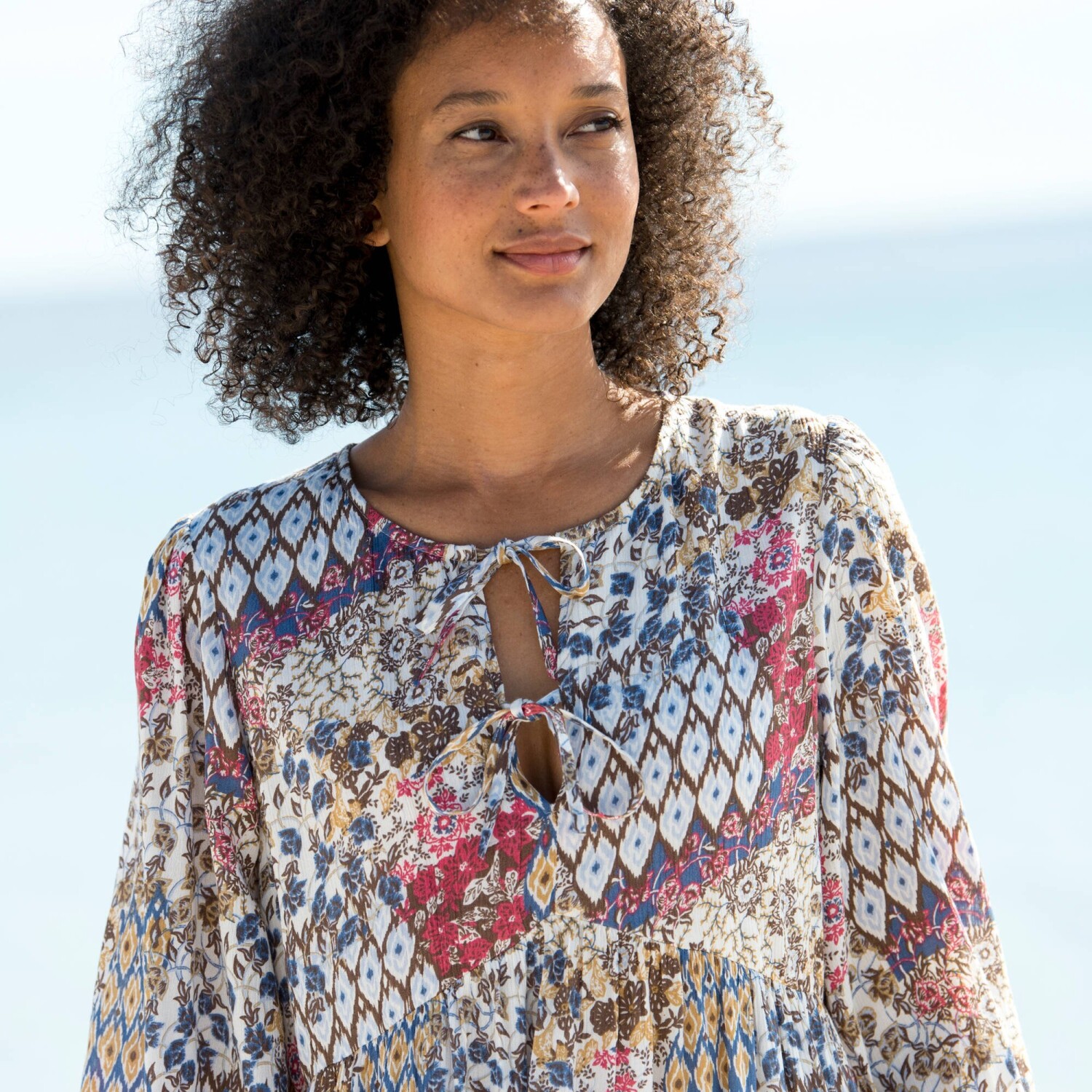 Rozkloszowana sukienka pulowerowa zachwyca pięknym wzorem i bufiastymi rękawami. Bufiaste, długie rękawy zakończone ściągaczem. Lekko dopasowana talia. Przedłużony krój. Można prać w pralce.