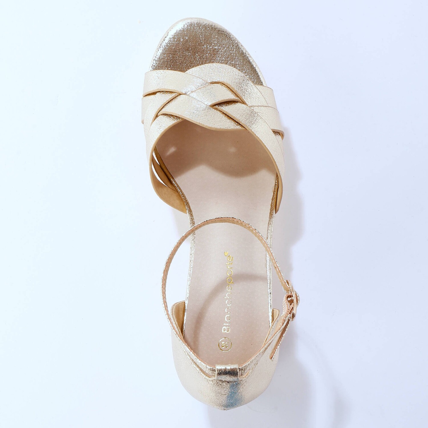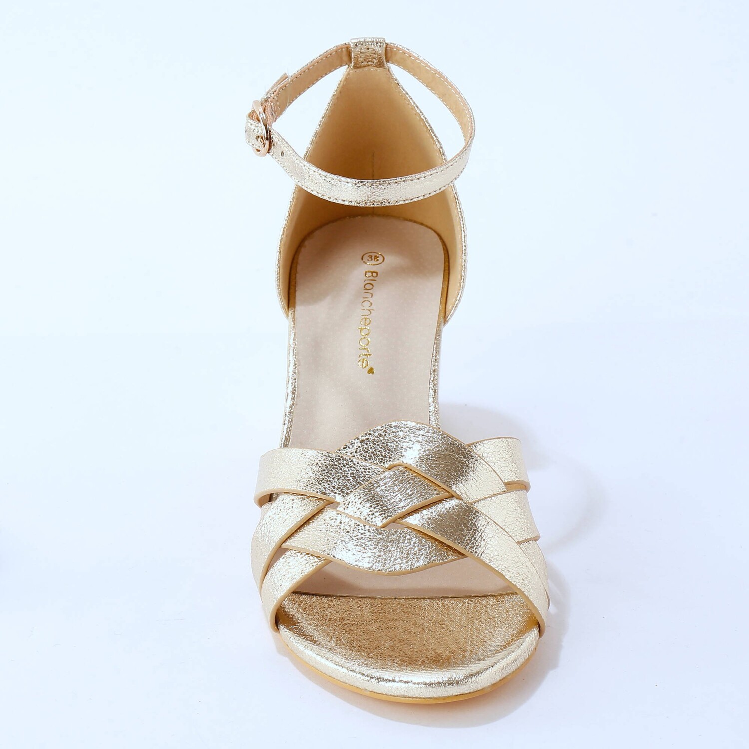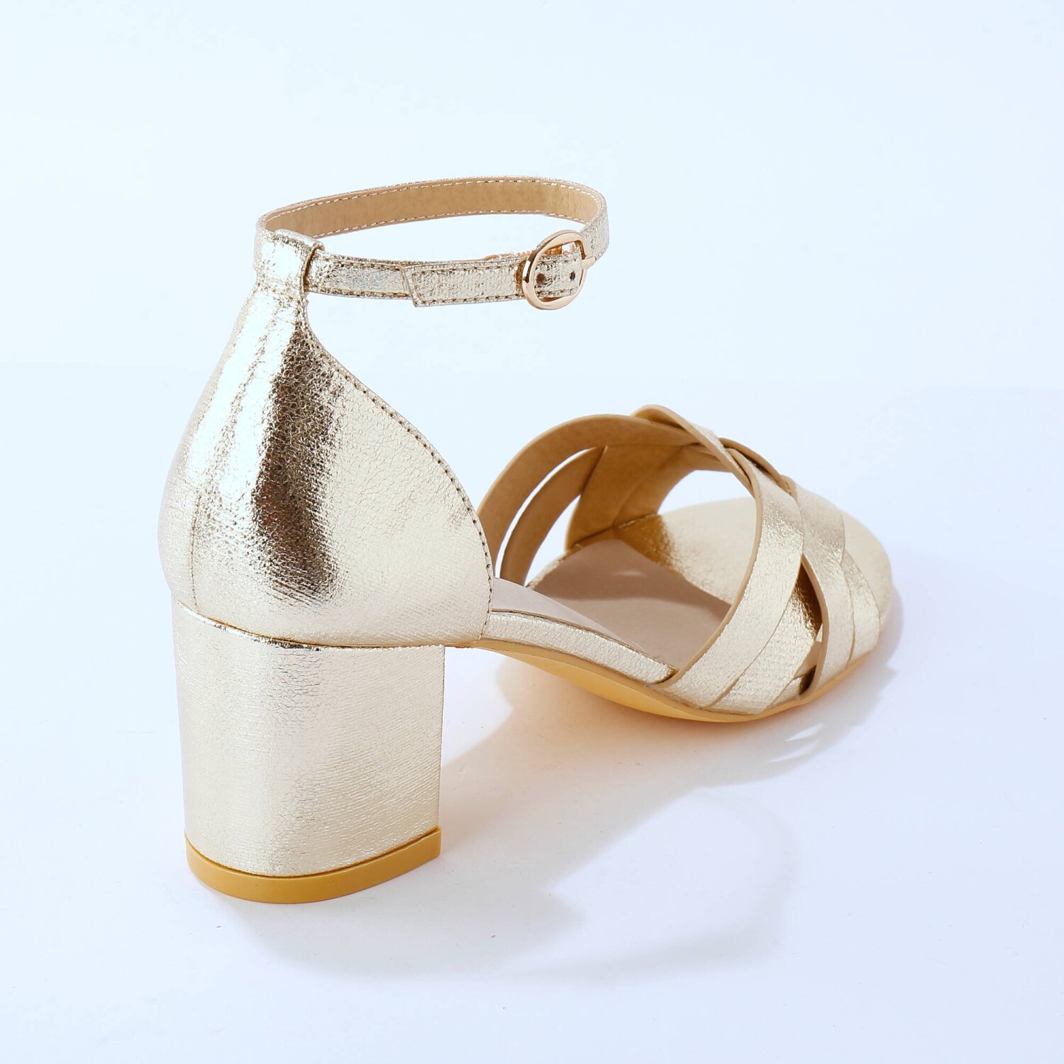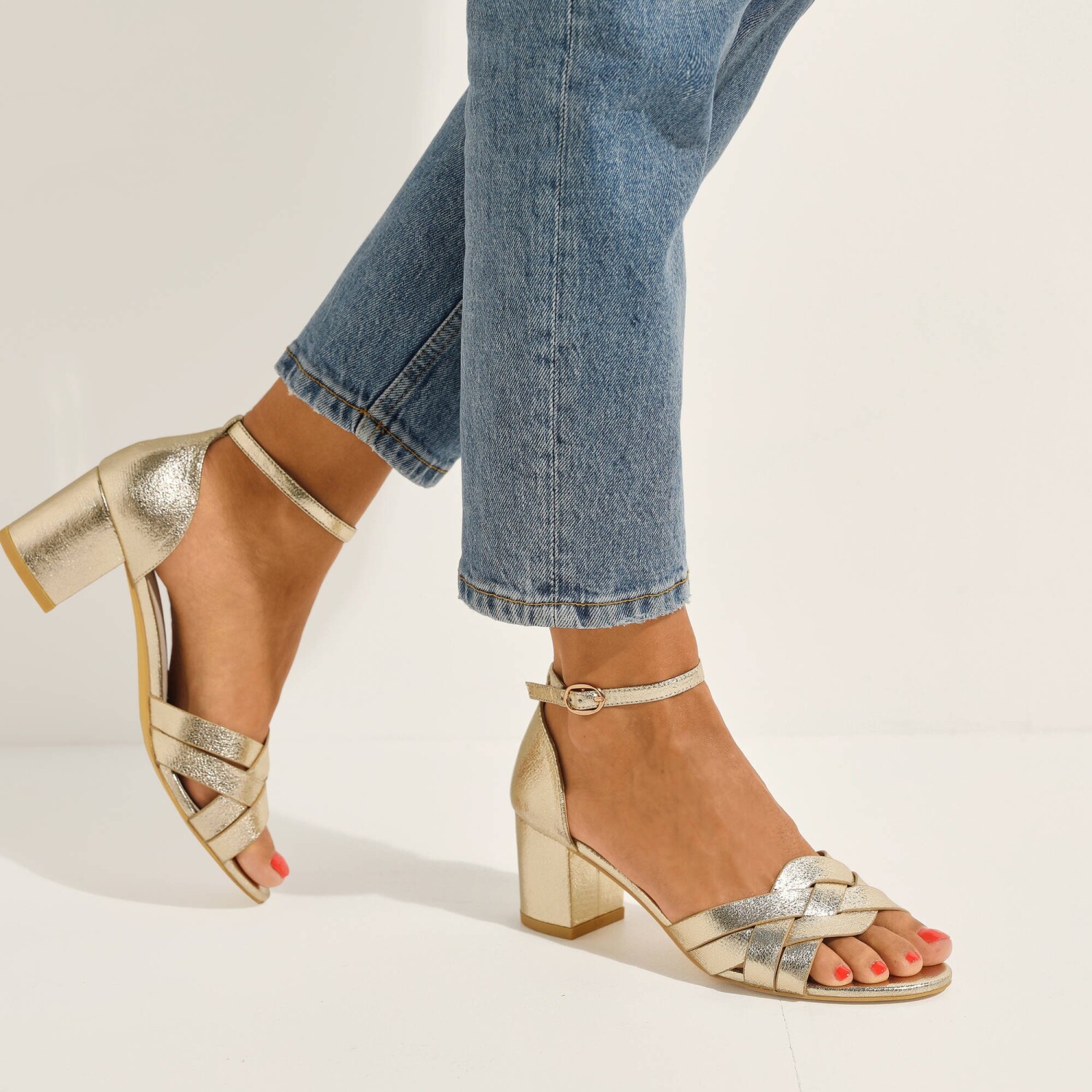Zabłyśnij w złotych sandałach na obcasie i bądź nie do przeoczenia. Skórzana wkładka na piankowym podkładzie. Pasek wokół kostki do personalizacji. Stały obcas. Szeroki, powlekany i stabilny obcas. Skrzyżowane paski na cholewce.
