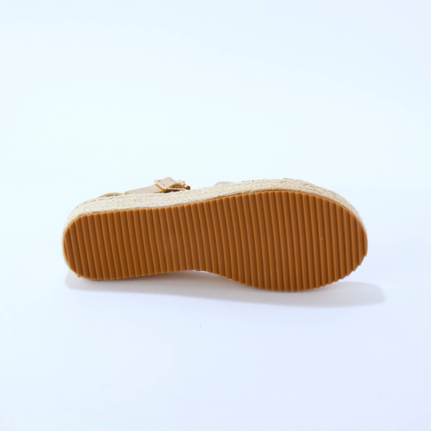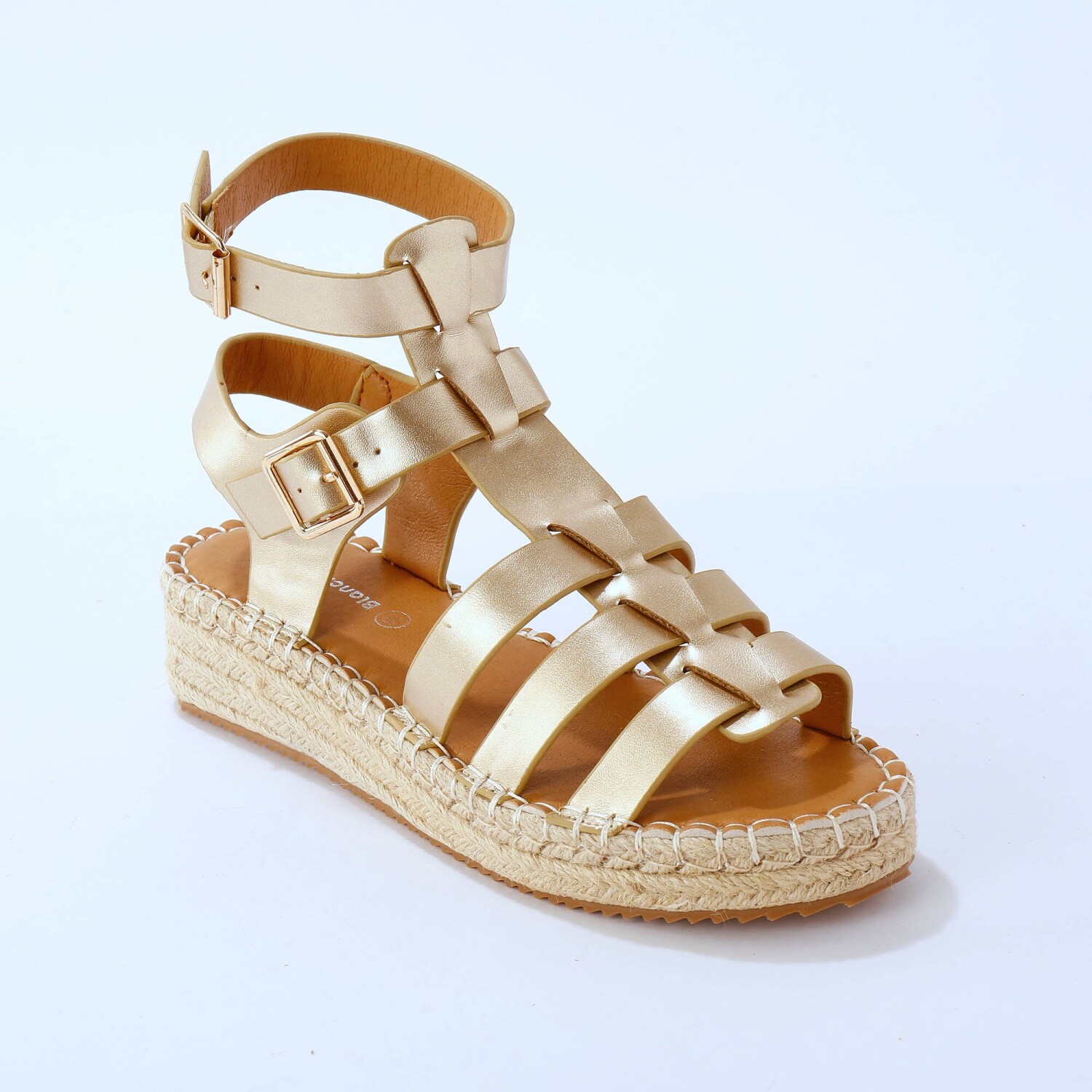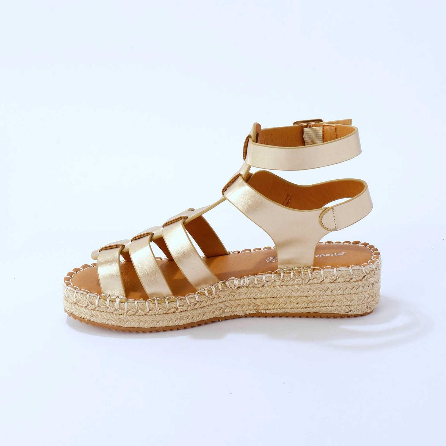 Sandały z paskami strappy to letnie obuwie par excellence. 2 paski z klamrą wokół kostki + gumka do personalizacji. Na górnych paskach. Klinowa podeszwa o wyglądzie lycry. Antypoślizgowa cienka podeszwa z elastomeru.