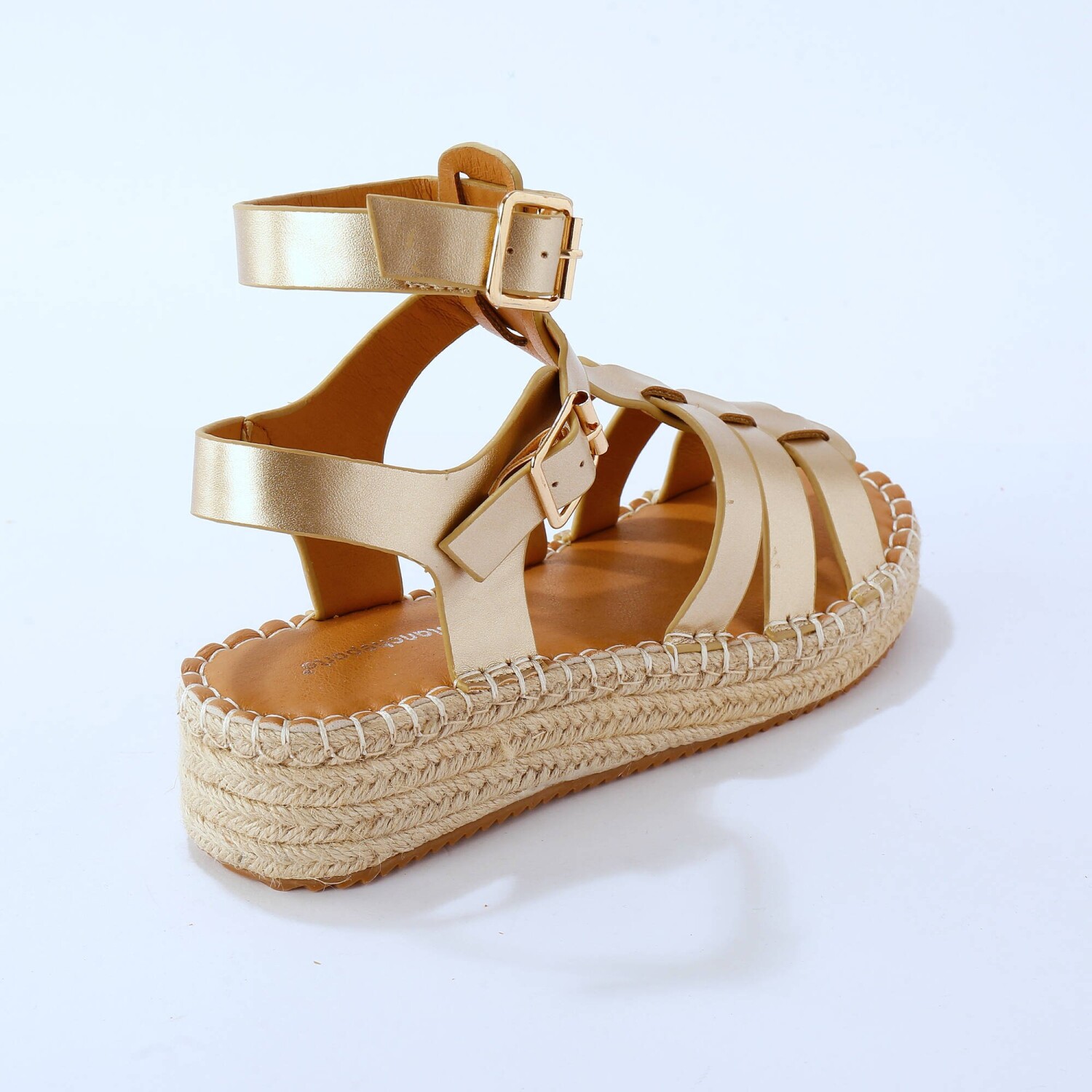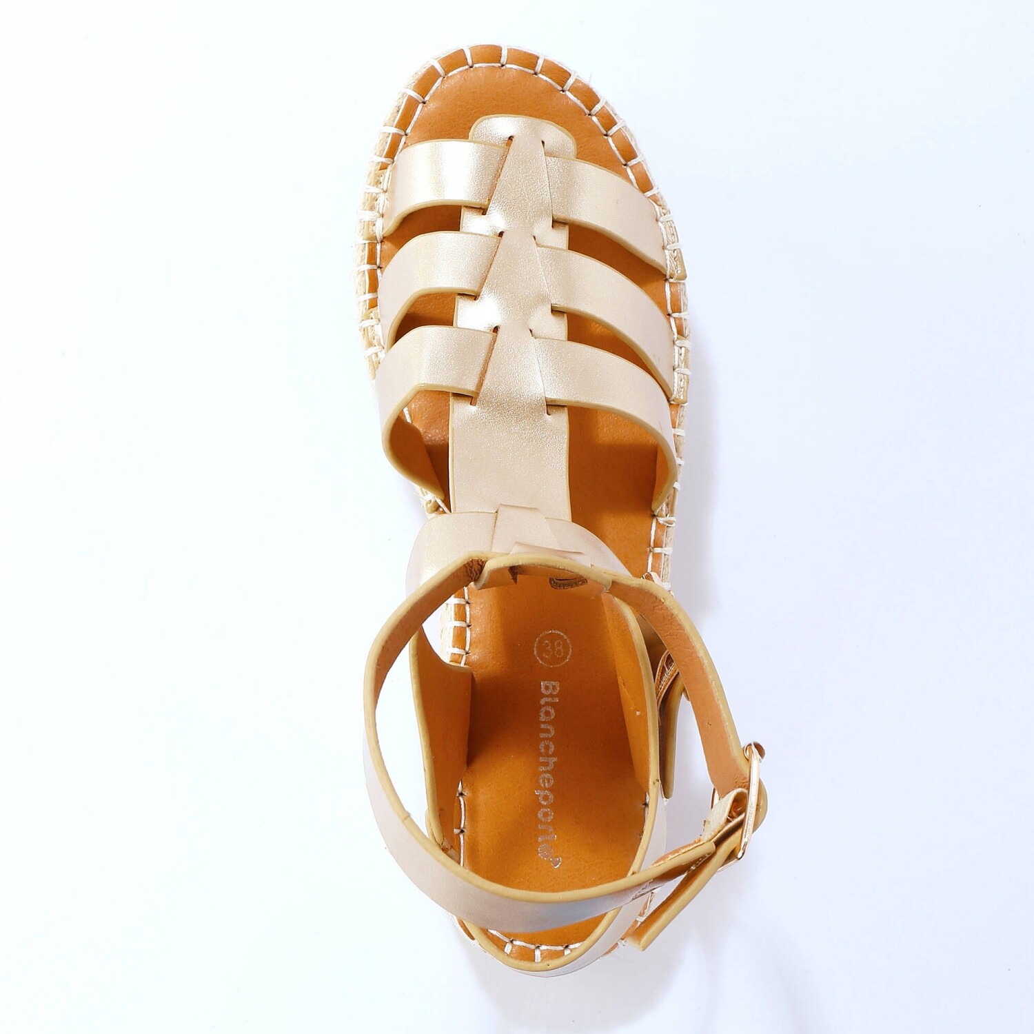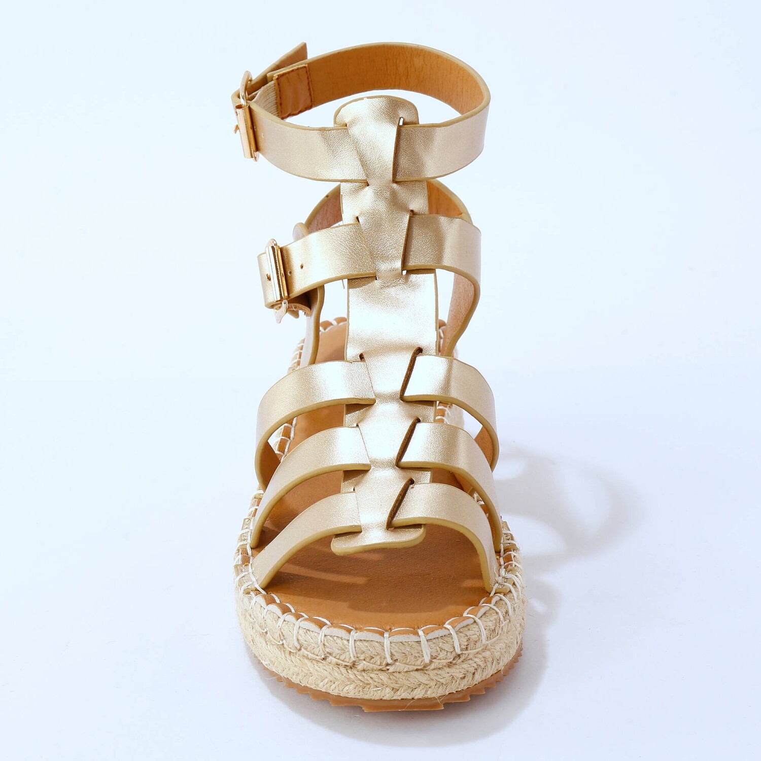 Sandały z paskami strappy to letnie obuwie par excellence. 2 paski z klamrą wokół kostki + gumka do personalizacji. Na górnych paskach. Klinowa podeszwa o wyglądzie lycry. Antypoślizgowa cienka podeszwa z elastomeru.
