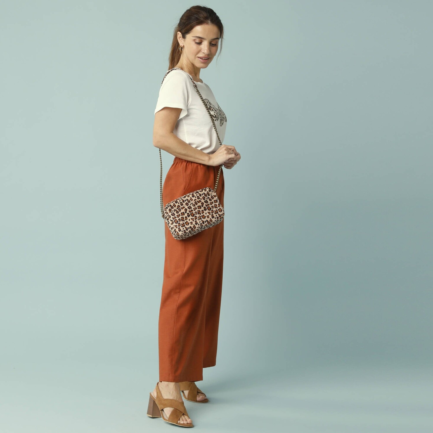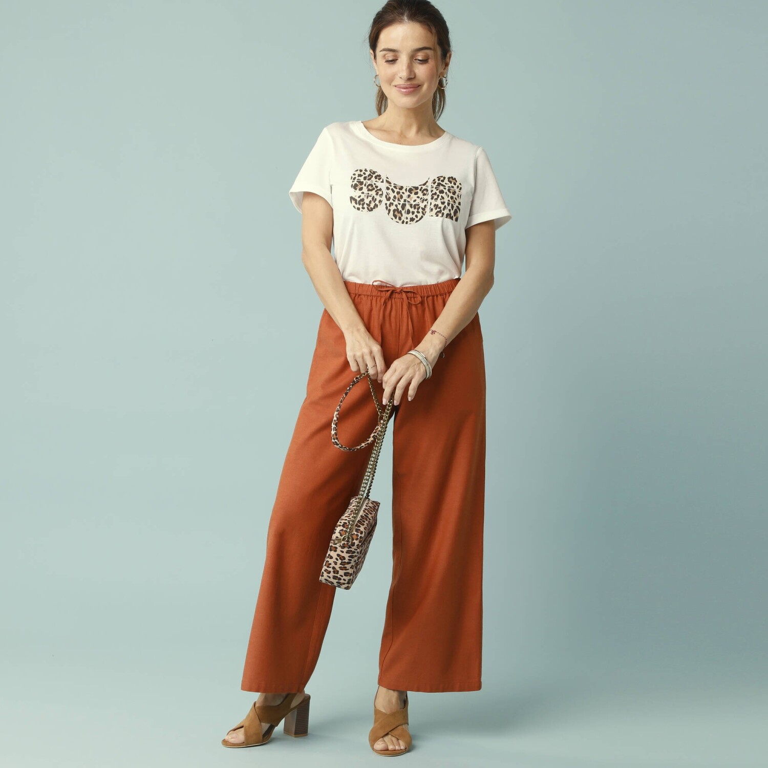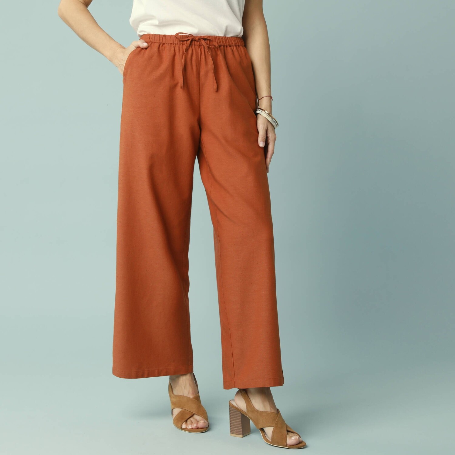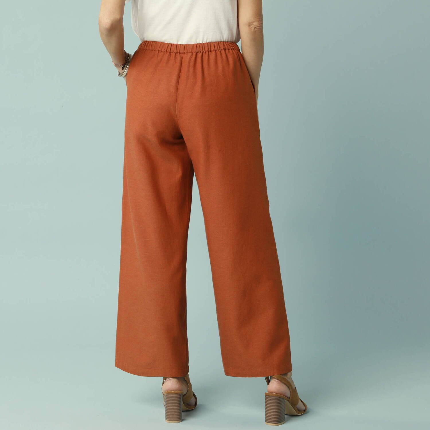 Wysoki stan. Szeroki krój. Profilowana talia z przodu, gumka z tyłu. Zapięcie na zamek błyskawiczny i guzik. Zakładki z przodu. 2 kieszenie z patką. 2 zaszewki z tyłu. Można prać w pralce.