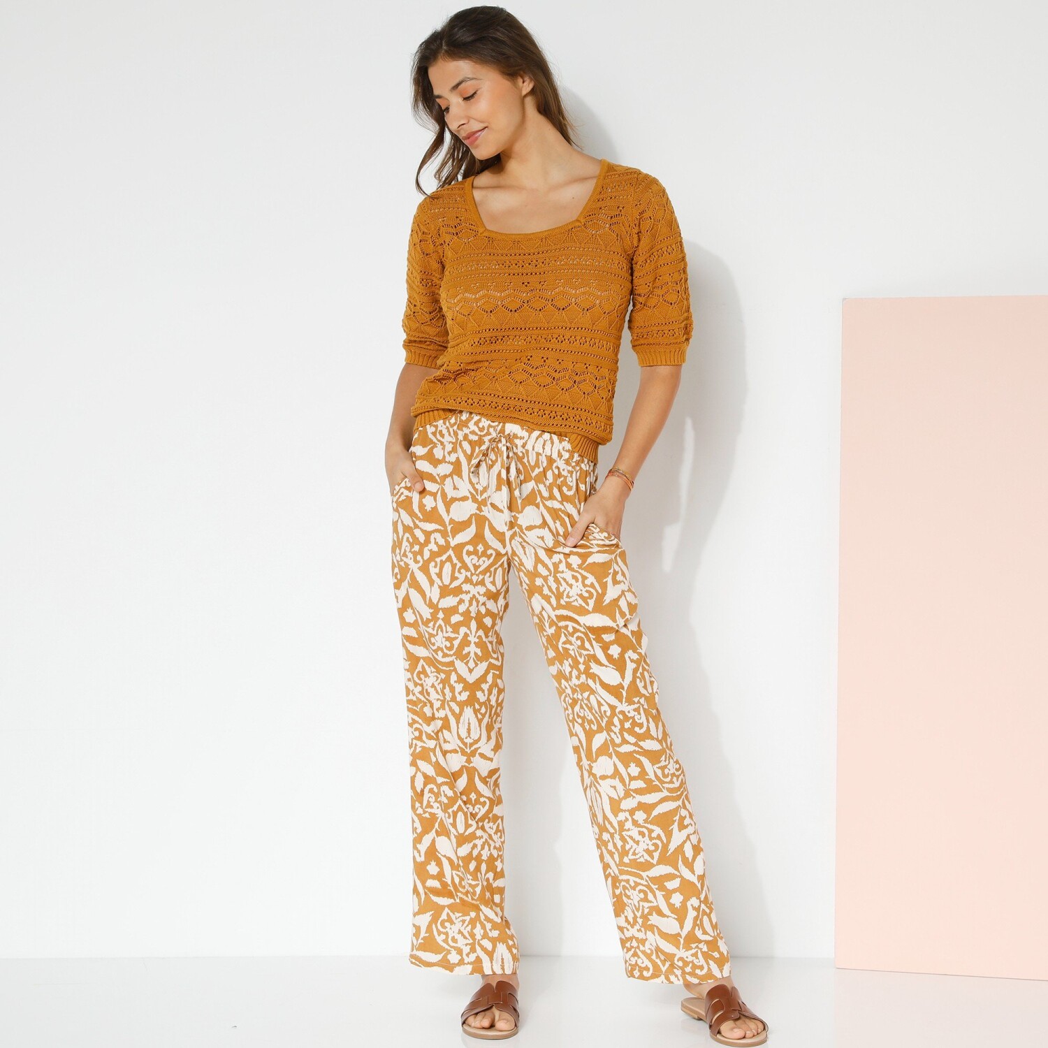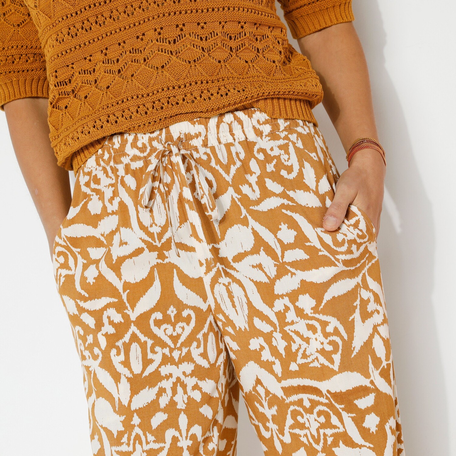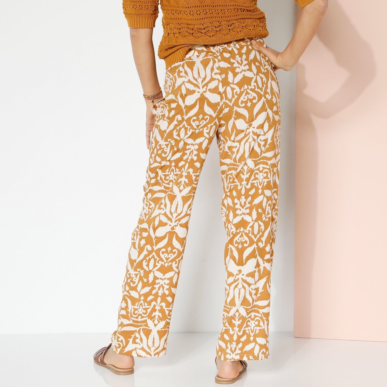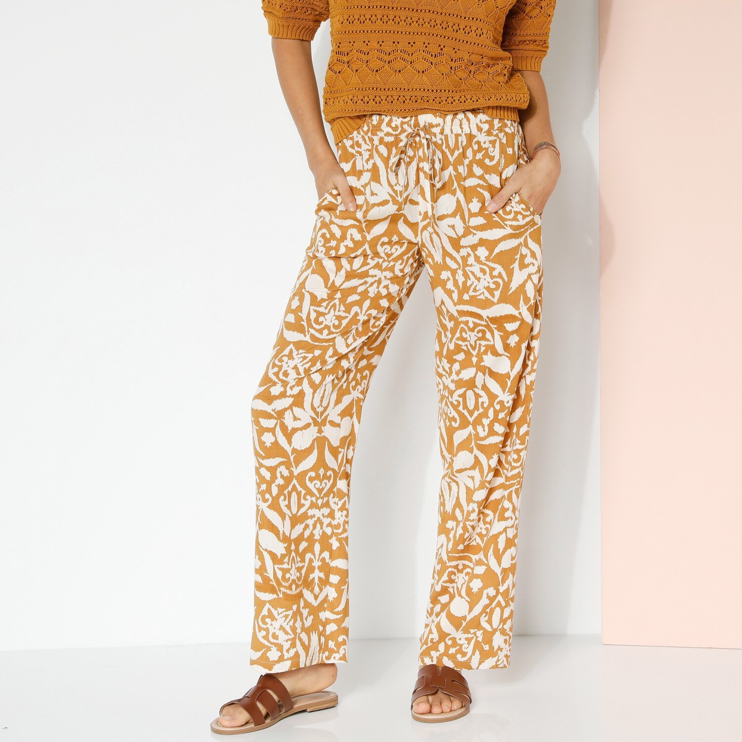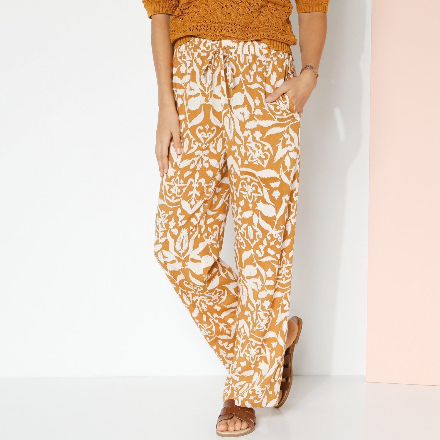 Zwiewne, szerokie spodnie z kwiatowym nadrukiem sprawdzą się zarówno na co dzień, jak i na wieczór. Szeroki, dopasowany krój. Regularna wysokość talii. Elastyczny pas ze sznurkiem. 2 kieszenie w szwach bocznych. Szerokie nogawki z obszyciem. Ten produkt został wykonany z wiskozy Lenzing™ EcoVero™. EcoViscose to materiał wykonany z pulpy pochodzącej z lasów zarządzanych w sposób zrównoważony. Proces produkcji zużywa mniej wody i energii. Można prać w pralce.