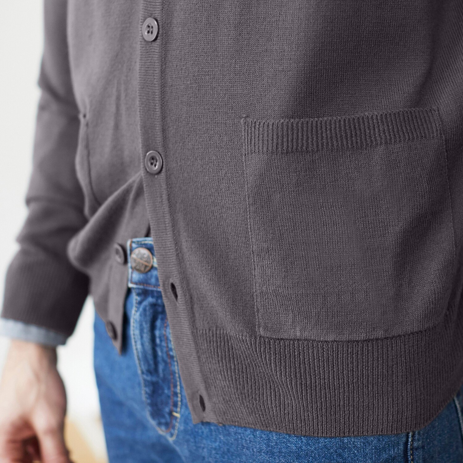 Elegancki dzianinowy sweter męski z dekoltem w serek i zapięciem na guziki. Ma długie rękawy i 2 kieszenie z przodu. Wygodny w noszeniu i bardzo łatwy w utrzymaniu. Marka Excellence to gwarancja jakości. Można prać w pralce.