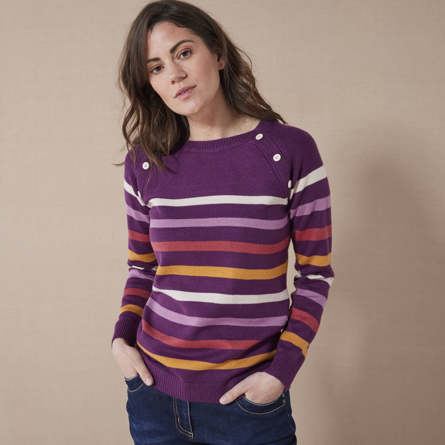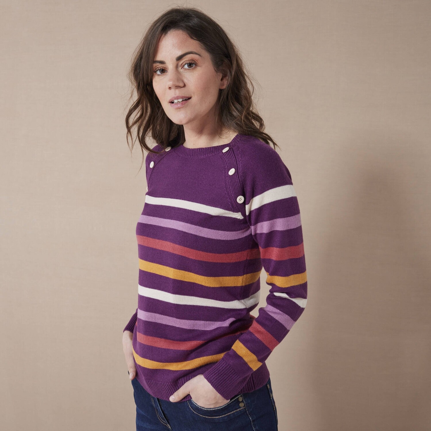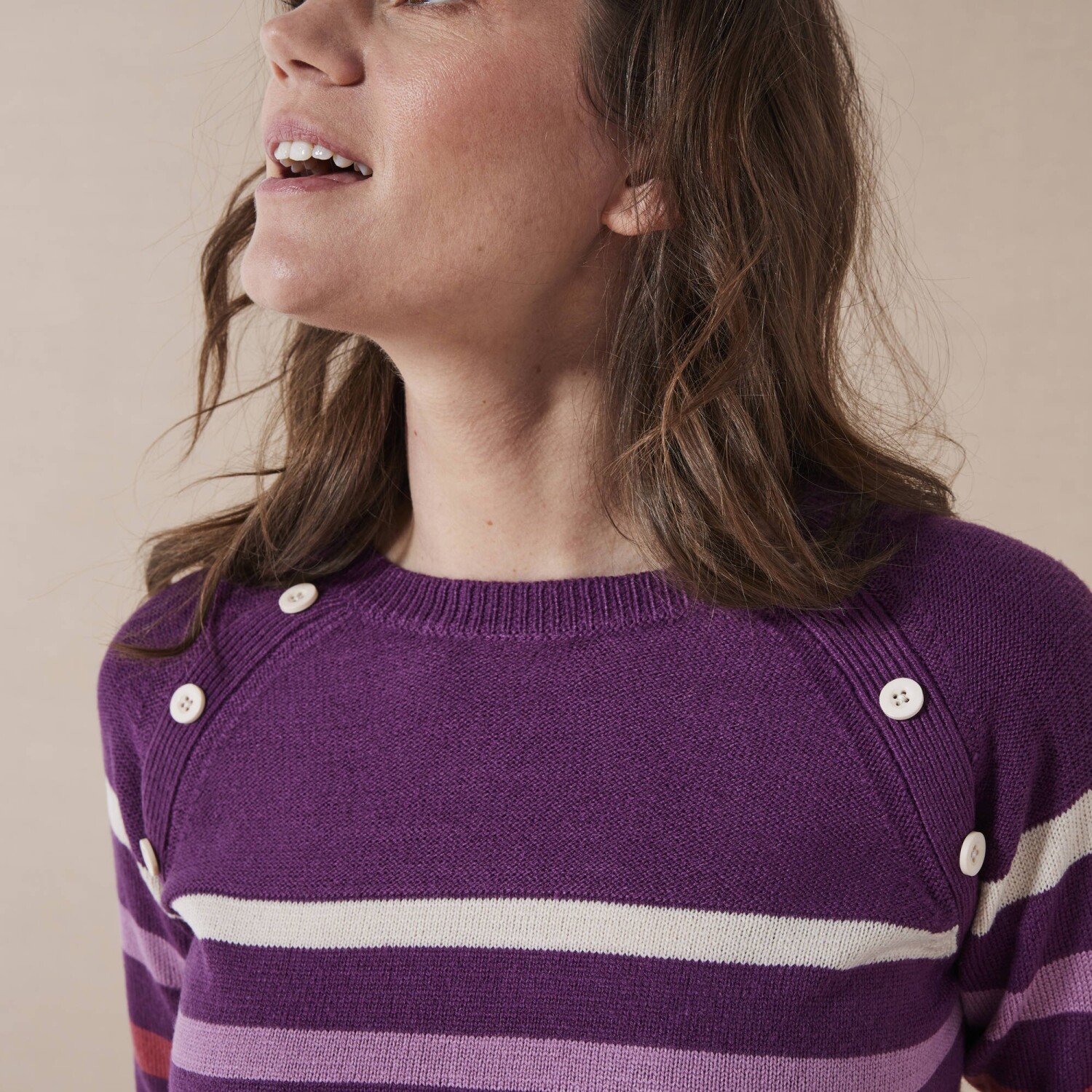 Modny sweter w paski z oryginalnymi guzikami stanie się niezbędnym elementem garderoby. Sweter w paski ma okrągły, luźny dekolt. Guziki z przodu pod dekoltem. Długie raglanowe rękawy. Prosty dół. Można prać w pralce.