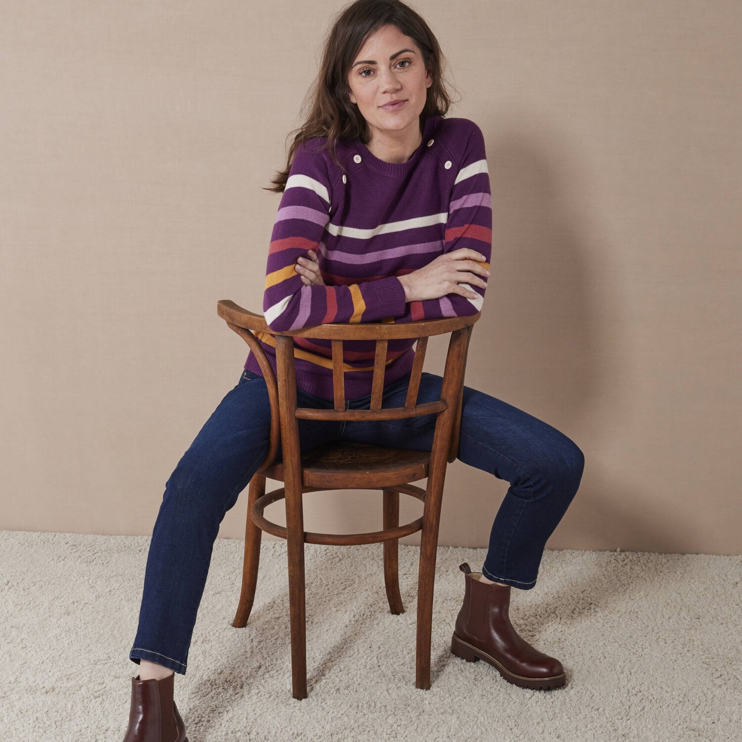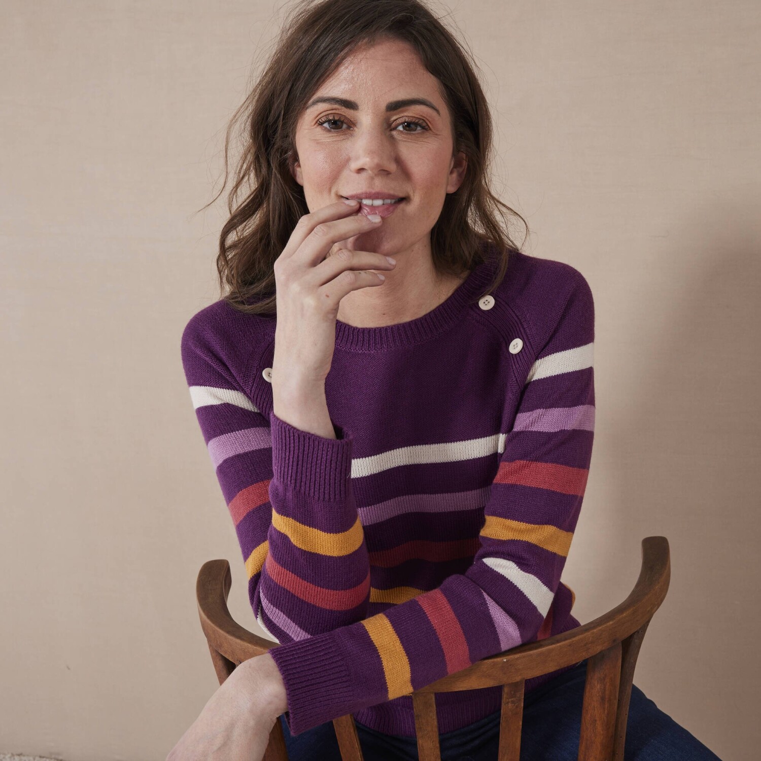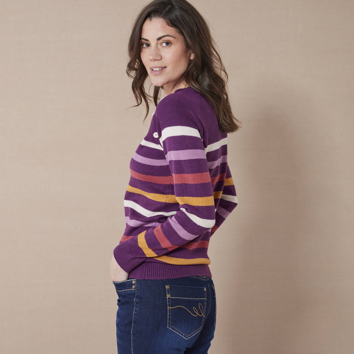 Modny sweter w paski z oryginalnymi guzikami stanie się niezbędnym elementem garderoby. Sweter w paski ma okrągły, luźny dekolt. Guziki z przodu pod dekoltem. Długie raglanowe rękawy. Prosty dół. Można prać w pralce.