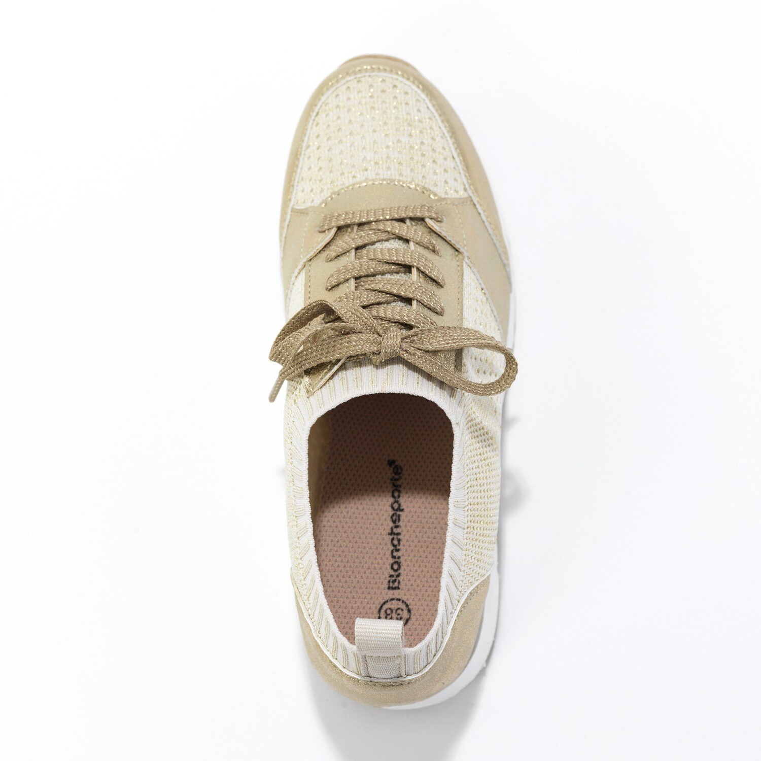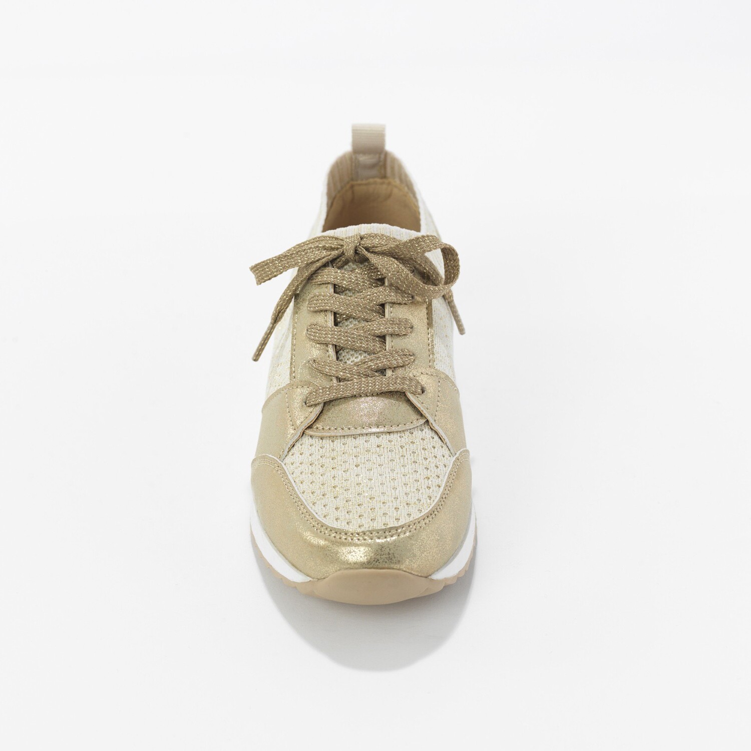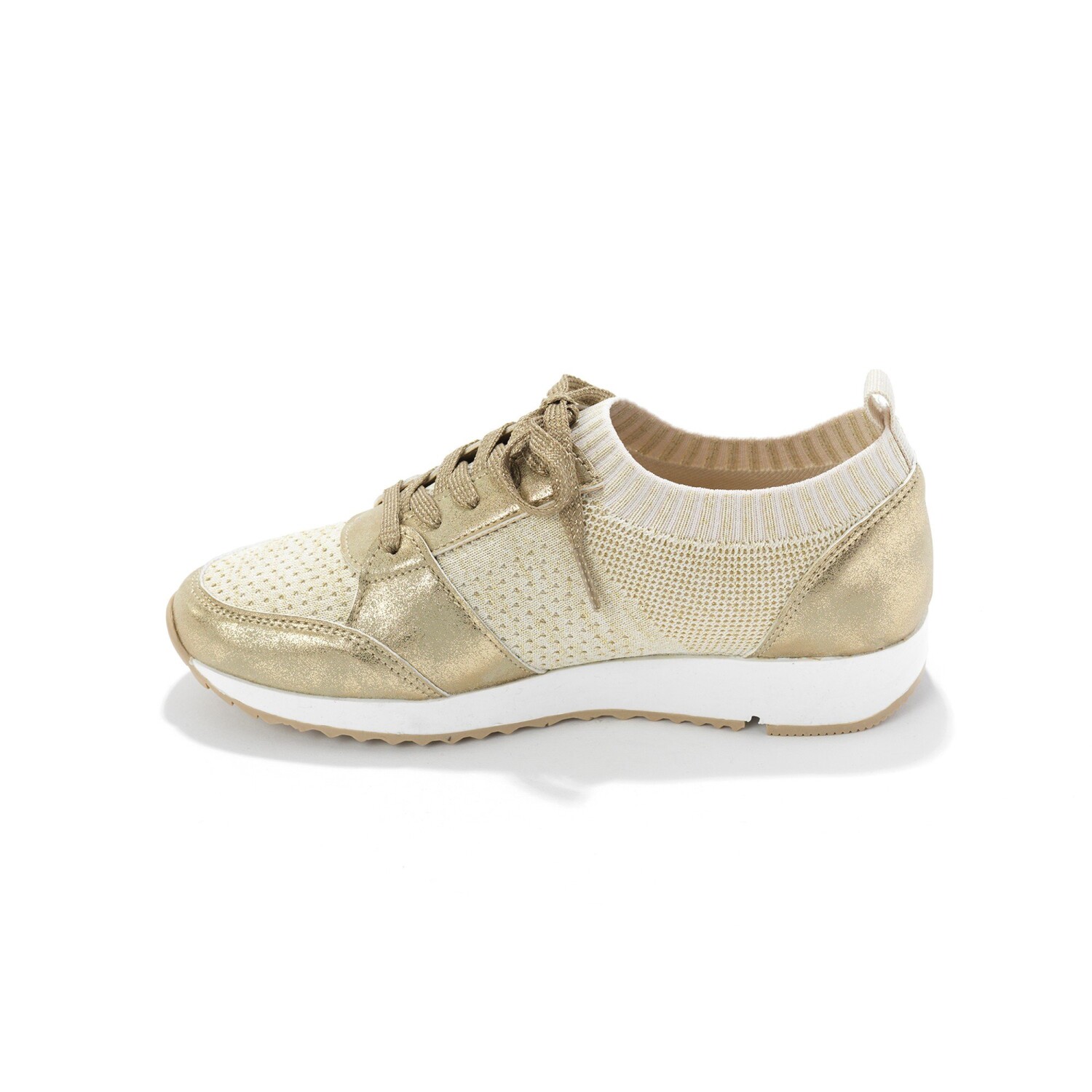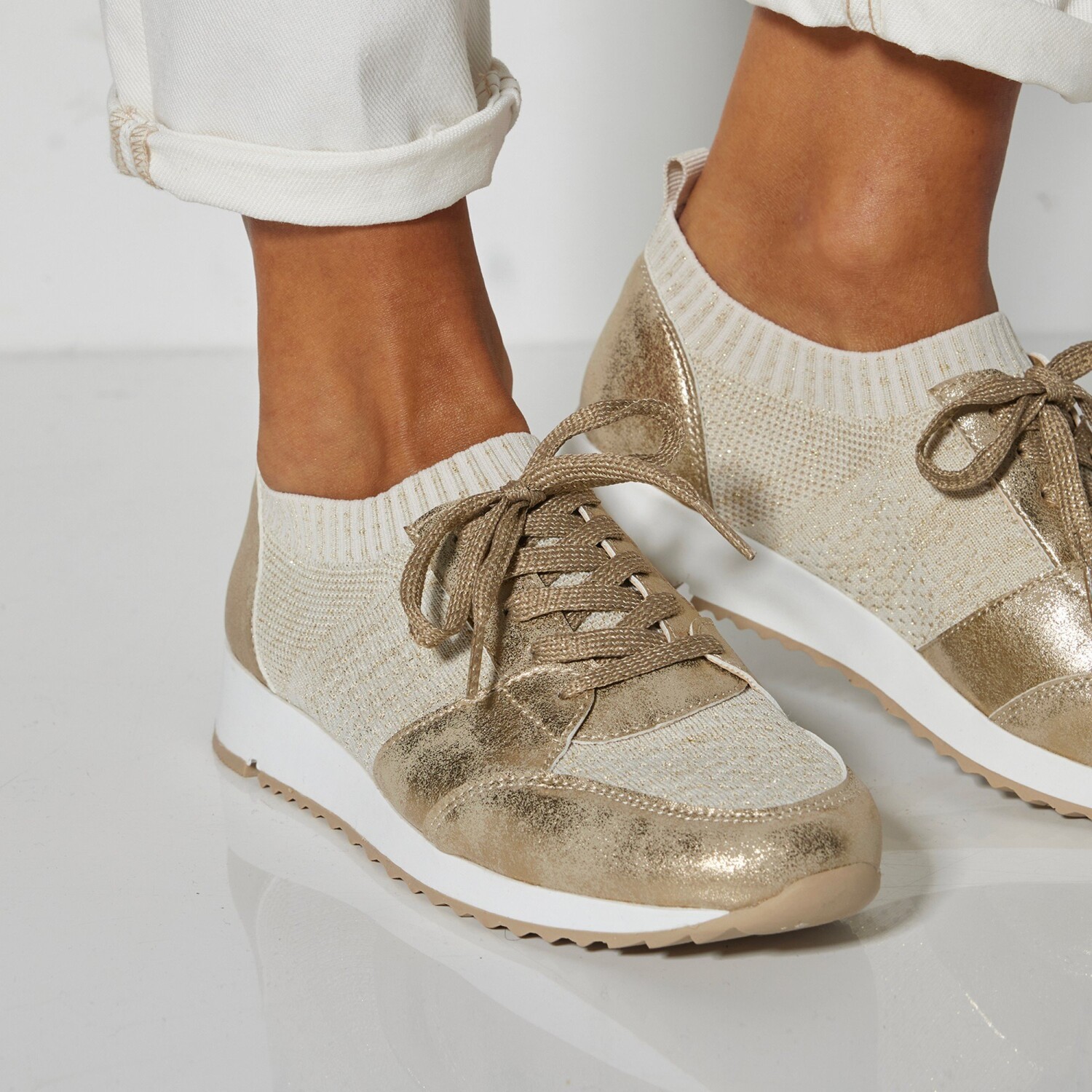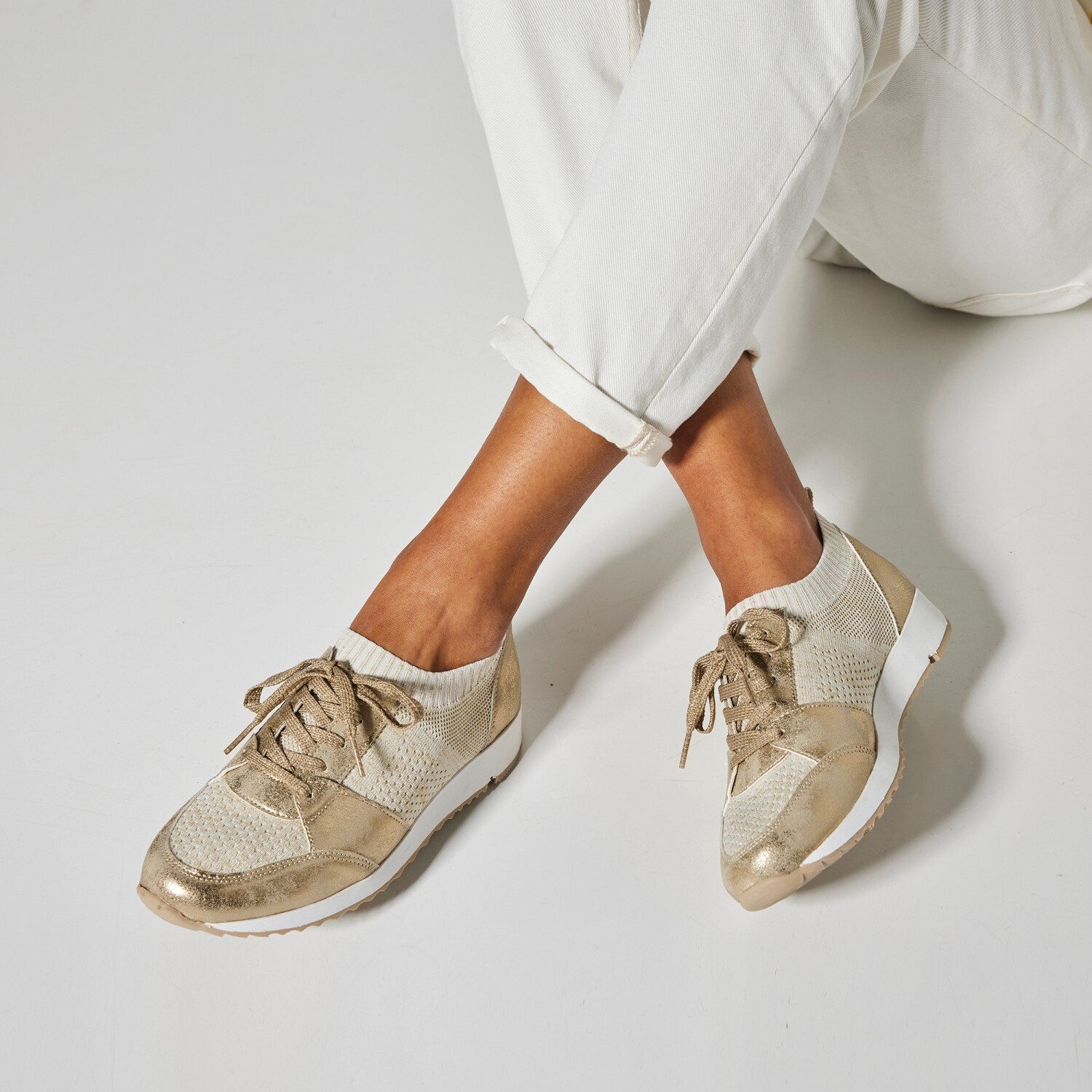 Dzięki elastycznemu materiałowi, z którego są wykonane, będziesz nosić wygodne trampki w mgnieniu oka. W sportowo-eleganckim stylu są zawsze wygodne w każdym przypadku. Cholewka z błyszczącej dzianiny z zamszowymi wstawkami. Bardzo elastyczna goleń. Elastyczny ściągacz wokół kostki. Piankowa wkładka zapewniająca miękki komfort. Płaskie sznurowadła z brokatową nitką. Stały podbicie. Tylny pasek. Antypoślizgowa podeszwa z klinem. Buty należy regularnie pielęgnować środkiem chroniącym przed plamami i wilgocią.