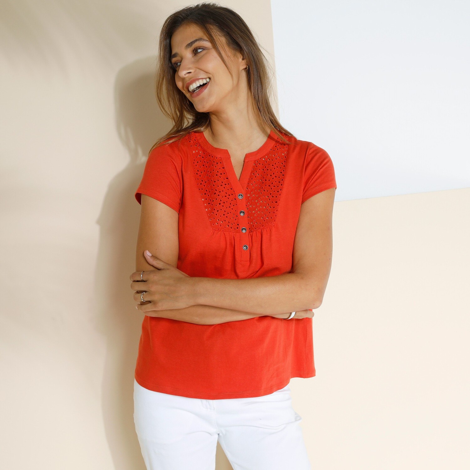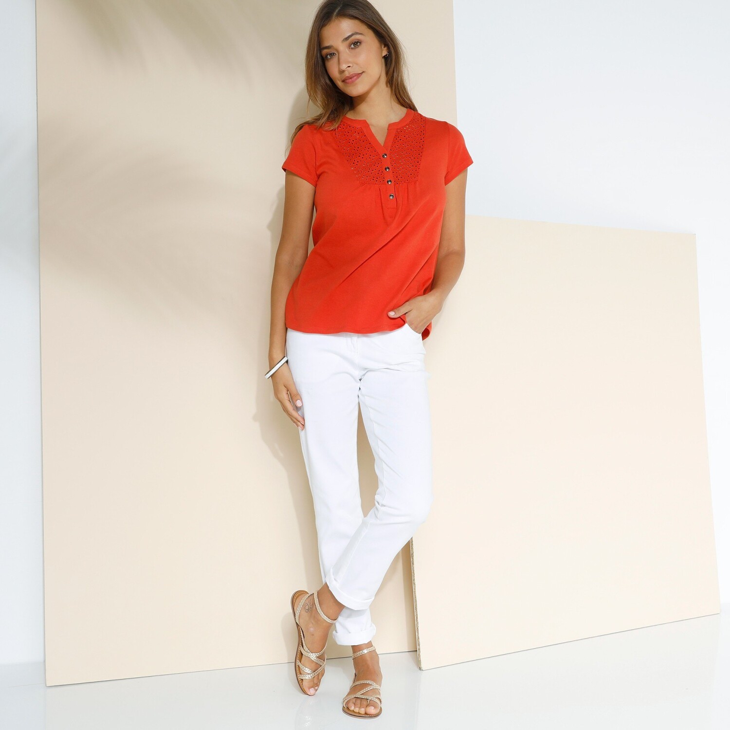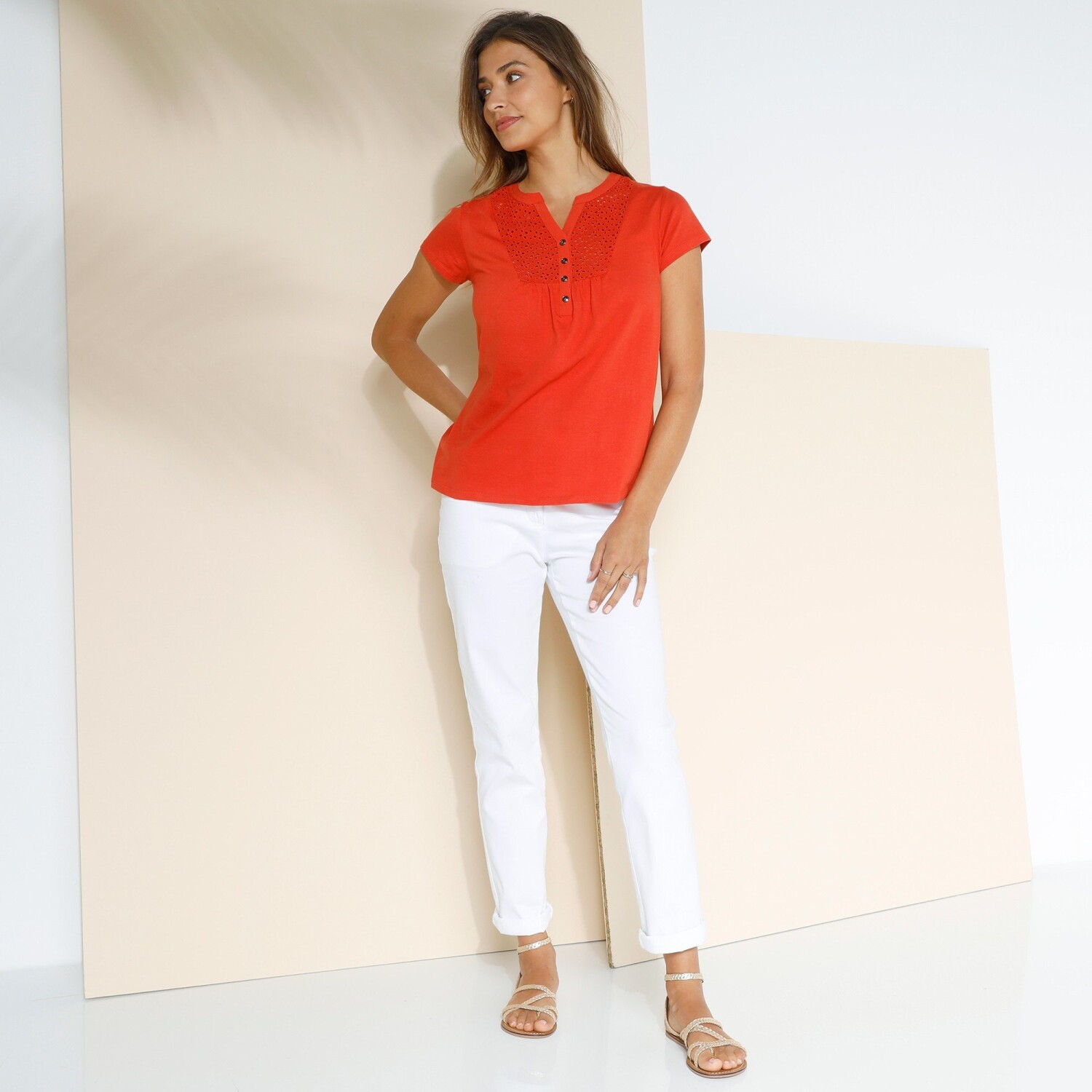 Dzianinowa koszulka z krótkim rękawem wyróżnia się pięknym ażurowym wzorem. Oryginalna dzianina z mieszanki bawełny i akrylu. Luźny, wygodny krój. Okrągły, luźny dekolt. Opuszczone ramiona tworzące krótkie rękawy. Zwężany, prążkowany dół. Można prać w pralce.