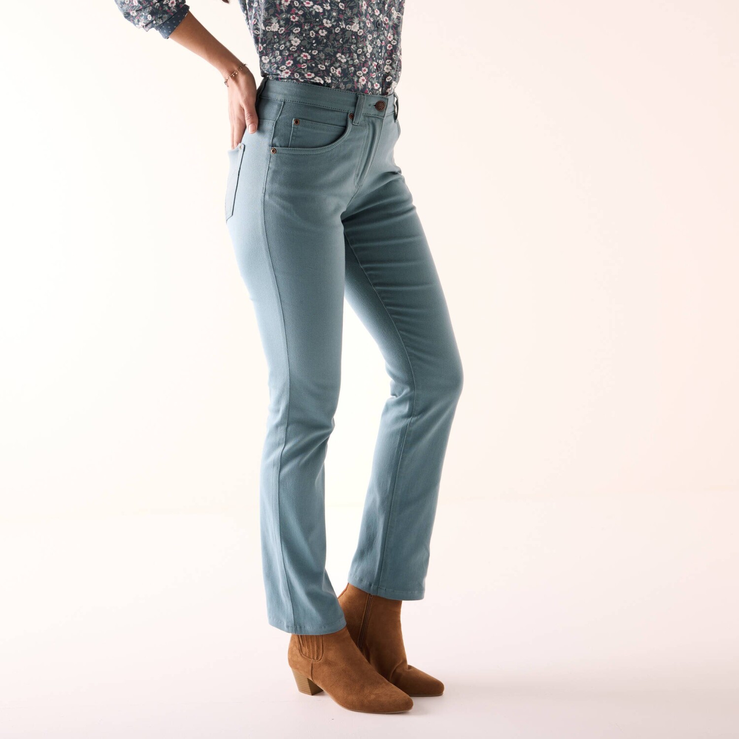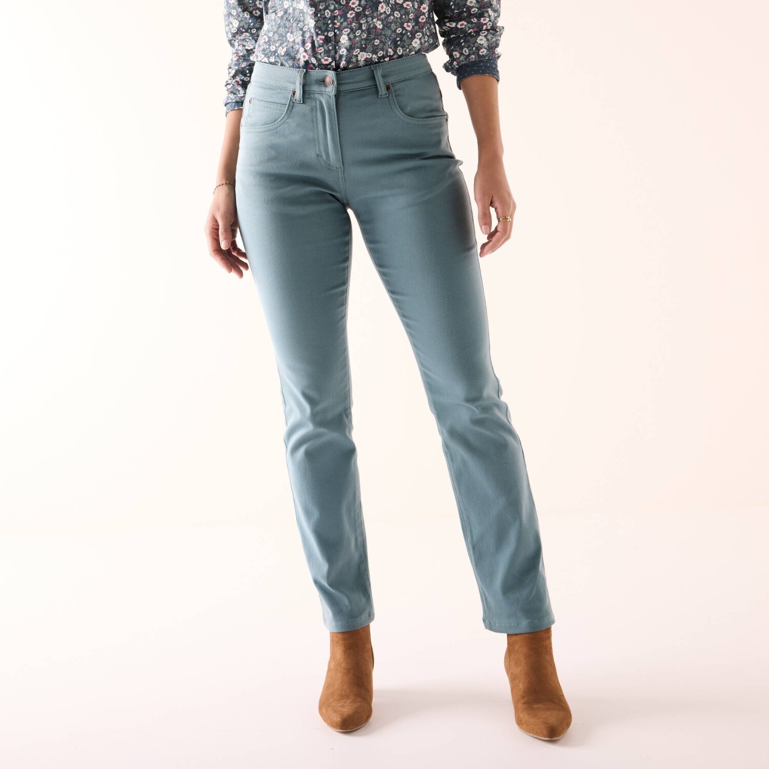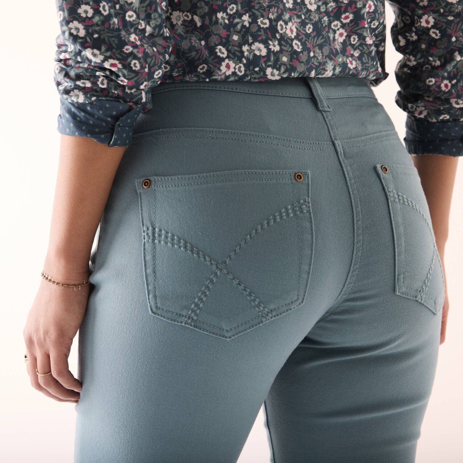 Wykonane z elastycznego materiału, te spodnie zmniejszają pośladki i modelują uda! Normalna wysokość talii. Elastyczna talia z tyłu po bokach od rozmiaru 44. Podwyższony tył. 2 kieszenie z przodu. 2 kieszenie z haftem z tyłu. Rozciągliwy materiał zapewniający swobodę ruchów. Można prać w pralce.